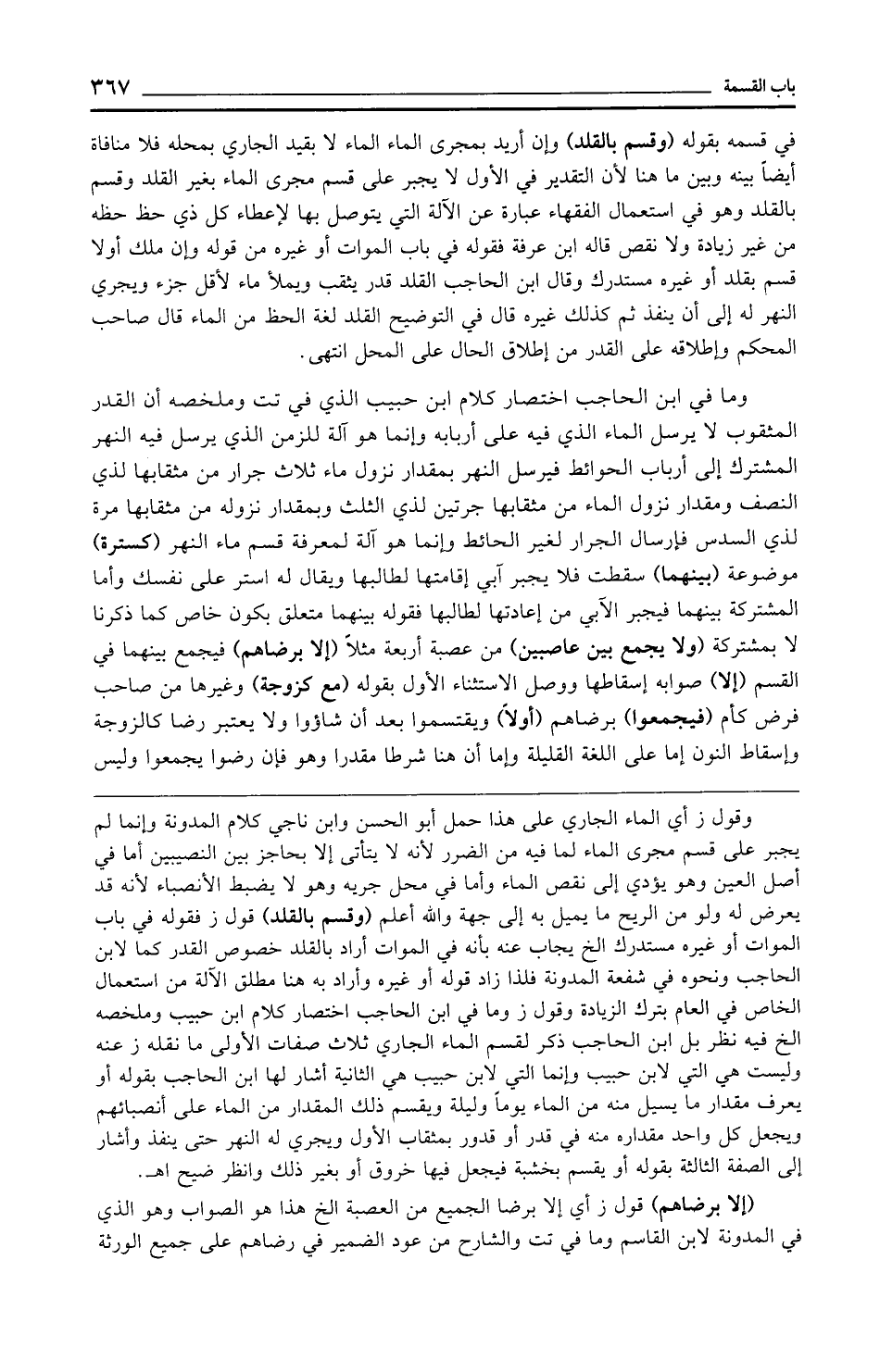 وما في ابن الحاجب اختصار كلام ابن حبيب الذي في تت وملخصه أن القدر المثقوب لا يرسل الماء الذي فيه على أربابه وإنما هو آلة للزمن الذي يرسل فيه النهر المشترك إلى أرباب الحوائط فيرسل النهر بمقدار نزول ماء ثلاث جرار من مثقابها لذي النصف ومقدار نزول الماء من مثقابها جرتين لذي الثلث وبمقدار نزوله من مثقابها مرة لذي السدس فإرسال الجرار لغير الحائط وإنما هو آلة لمعرفة قسم ماء النهر (كسترة) موضوعة (بينهما) سقطت فلا يجبر آبي إقامتها لطالبها ويقال له استر على نفسك وأما المشتركة بينهما فيجبر الآبي من إعادتها لطالبها فقوله بينهما متعلق يكون خاص كما ذكرنا لا بمشتركة (ولا يجمع بين عاصبين) من عصبة أربعة مثلًا (إلا برضاهم) فيجمع بينهما في القسم (إلا) صوابه إسقاطها ووصل الاستثناء الأول بقوله (مع كزوجة) وغيرها من صاحب فرض كأم (فيجمعوا) برضاهم (أولًا) ويقتسموا بعد أن شاؤوا ولا يعتبر رضا كالزوجة وإسقاط النون إما على اللغة القليلة وإما أن هنا شرطا مقدرا وهو فإن رضوا يجمعوا وليس