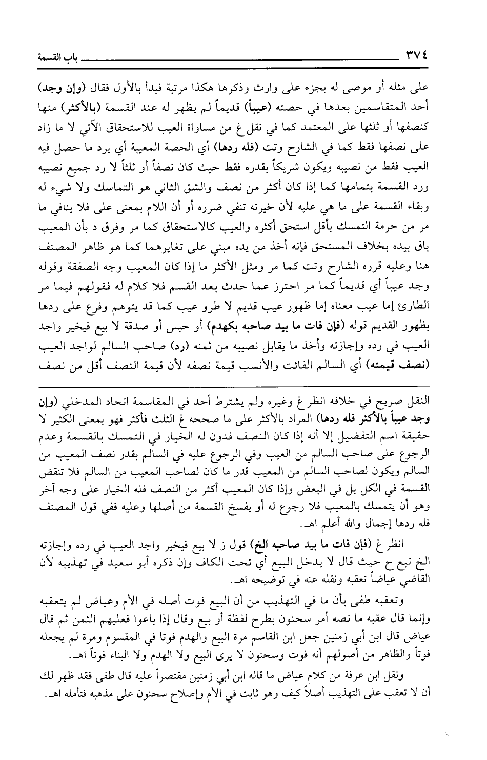 النقل صريح في خلافه انظر غ وغيره ولم يشترط أحد في المقاسمة اتحاد المدخلي (وإن وجد عيبًا بالأكثر فله ردها) المراد بالأكثر على ما صححه غ الثلث فأكثر فهو بمعنى الكثير لا حقيقة اسم التفضيل إلا أنه إذا كان النصف فدون له الخيار في التمسك بالقسمة وعدم الرجوع على صاحب السالم من العيب وفي الرجوع عليه في السالم بقدر نصف المعيب من السالم ويكون لصاحب السالم من المعيب قدر ما كان لصاحب المعيب من السالم فلا تنقض القسمة في الكل بل في البعض وإذا كان المعيب أكثر من النصف فله الخيار على وجه آخر وهو أن يتمسك بالمعيب فلا رجوع له أو يفسخ القسمة من أصلها وعليه ففي قول المصنف فله ردها إجمال والله أعلم اهـ.