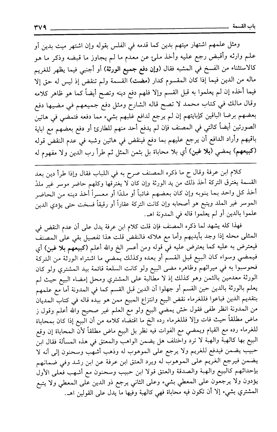 كلام ابن عرفة وقال ح ما ذكره المصنف صرح به في اللباب فقال وإذا طرأ دين بعد القسمة يغترق التركة أخذ ذلك من يد الورثة وإن كان لا يغترقها وكلهم حاضر موسر غير ملدّ أخذ كل واحد بما ينوبه وإن كان بعضهم غائبًا أو ملدًّا أو معسرًا أخذ دينه من الحاضر الموسر غير الملك ويتبع هو أصحابه وإن كانت التركة عقارًا أو رقيقًا فسخت حتى يؤدي الدين علموا بالدين أو لم يعلموا قاله في المدونة اهـ.