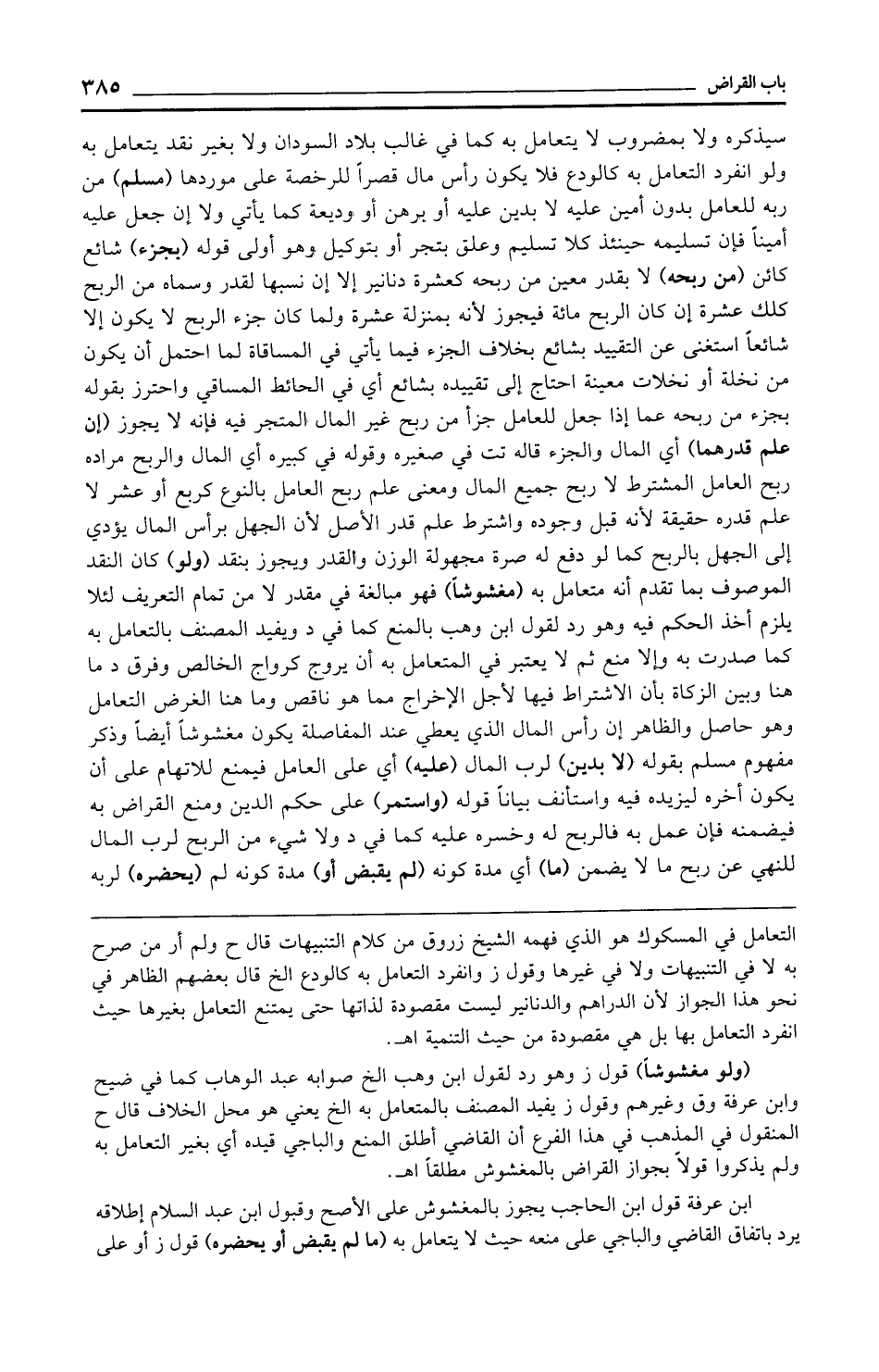 سيذكره ولا بمضروب لا يتعامل به كما في غالب بلاد السودان ولا بغير نقد يتعامل به ولو انفرد التعامل به كالودع فلا يكون رأس مال قصرًا للرخصة على موردها (مسلم) من ربه للعامل بدون أمين عليه لا بدين عليه أو يرهن أو وديعة كما يأتي ولا إن جعل عليه أمينًا فإن تسليمه حينئذ كلا تسليم وعلق بتجر أو بتوكيل وهو أولى قوله (بجزء) شائع كائن (من ربحه) لا بقدر معين من ربحه كعشرة دنانير إلا إن نسبها لقدر وسماه من الربح كلك عشرة إن كان الربح مائة فيجوز لأنه بمنزلة عشرة ولما كان جزء الربح لا يكون إلا شائعًا استغنى عن التقييد بشائع بخلاف الجزء فيما يأتي في المساقاة لما احتمل أن يكون من نخلة أو نخلات معينة احتاج إلى تقييده بشائع أي في الحائط المساقي واحترز بقوله بجزء من ربحه عما إذا جعل للعامل جزأ من ربح غير المال المتجر فيه فإنه لا يجوز (إن علم قدرهما) أي المال والجزء قاله تت في صغيره وقوله في كبيره أي المال والربح مراده ربح العامل المشترط لا ربح جميع المال ومعنى علم ربح العامل بالنوع كربع أو عشر لا علم قدره حقيقة لأنه قبل وجوده واشترط علم قدر الأصل لأن الجهل برأس المال يؤدي إلى الجهل بالربح كما لو دفع له صرة مجهولة الوزن والقدر ويجوز بنقد (ولو) كان النقد الموصوف بما تقدم أنه متعامل به (مغشوشًا) فهو مبالغة في مقدر لا من تمام التعريف لئلا يلزم أخذ الحكم فيه وهو رد لقول ابن وهب بالمنع كما في د ويفيد المصنف بالتعامل به كما صدرت به وإلا منع ثم لا يعتبر في المتعامل به أن يروج كرواج الخالص وفرق د ما هنا وبين الزكاة بأن الاشتراط فيها لأجل الإخراج مما هو ناقص وما هنا الغرض التعامل وهو حاصل والظاهر إن رأس المال الذي يعطي عند المفاصلة يكون مغشوشًا أيضًا وذكر مفهوم مسلم بقوله (لا بدين) لرب المال (عليه) أي على العامل فيمنع للاتهام على أن يكون أخره ليزيده فيه واستأنف بيانًا قوله (واستمر) على حكم الدين ومنع القراض به فيضمنه فإن عمل به فالربح له وخسره عليه كما في د ولا شيء من الربح لرب المال للنهي عن ربح ما لا يضمن (ما) أي مدة كونه (لم يقبض أو) مدة كونه لم (يحضره) لربه