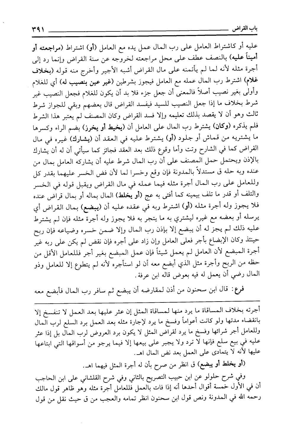 عليه أو كاشتراط العامل على رب المال عمل يده مع العامل (أو) اشتراط (مراجعته أو أمينًا عليه) بالنصف عطف على محل مراجعته لخروجه عن سنة القراض وإنما رد إلى أجرة مثله لأنه لما لم يأتمنه على مال القراض أشبه الأجير وأخرج منه قوله (بخلاف غلام) اشترط رب المال عمله مع العامل فيجوز بشرطين (غير عين بنصيب له) أي للغلام وأولى بغير نصيب أصلًا فالمعنى أن جعل جزء فلا بد أن يكون للغلام فجعل النصيب غير شرط بخلاف ما إذا جعل النصيب للسيد فيفسد القراض قال بعضهم وبقي للجواز شرط ثالث وهو أن لا يقصد بذلك تعليمه وإلا فسد القراض وكان المصنف لم يعتبر هذا الشرط فلم يذكره (وكان) يشترط رب المال على العامل أن (يخيط أو يخرز) بضم الراء وكسرها ما يشتريه من قماش أو جلود (أو) يشترط عليه في العقد أن (يشارك) غيره في مال القراض كما في الشارح وتت وأما وقوع ذلك بعد العقد فجائز كما سيأتي أن له أن يشارك بالإذن ويحتمل حمل المصنف على أن رب المال شرط عليه أن يشاركه العامل بمال من عنده وبه حله ق مستدلًا بالمدونة فإن وقع وخسرا لما لأن فض الخسر عليهما بقدر كل وللعامل على رب المال أجرة مثله فيما عمله في مال القراض ويقبل قوله في الخسر والتلف أو قدر ما تلف بيمينه كما أفتى به عج (أو يخلط) المال بماله أو بمال قراض عنده فلا يجوز وله أجرة مثله (أو) اشترط ربه في عقده عليه أن (يبضع) بمال القراض أي يرسله أو بعضه مع غيره ليشتري به ما يتجر به فلا يجوز وله أجرة مثله فإن لم يشترط عليه ذلك لم يجز له أن يبضع إلا بإذن رب المال وإلا ضمن خسره وضياعه فإن ربح حينئذ وكان الإبضاع بأجر فعلى العامل وإن زاد على أجره فإن نقض لم يكن على ربه غير أجرة المبضع لأن العامل لم يعمل شيئًا فإن عمل المبضع بغير أجر فللعامل الأقل من حظه من الربح وأجرة مثل الذي أبضع معه أن لو استأجره لأنه لم يتطوع إلا للعامل وذو المال رضي أن يعمل له فيه بعوض قاله ابن عرفة.