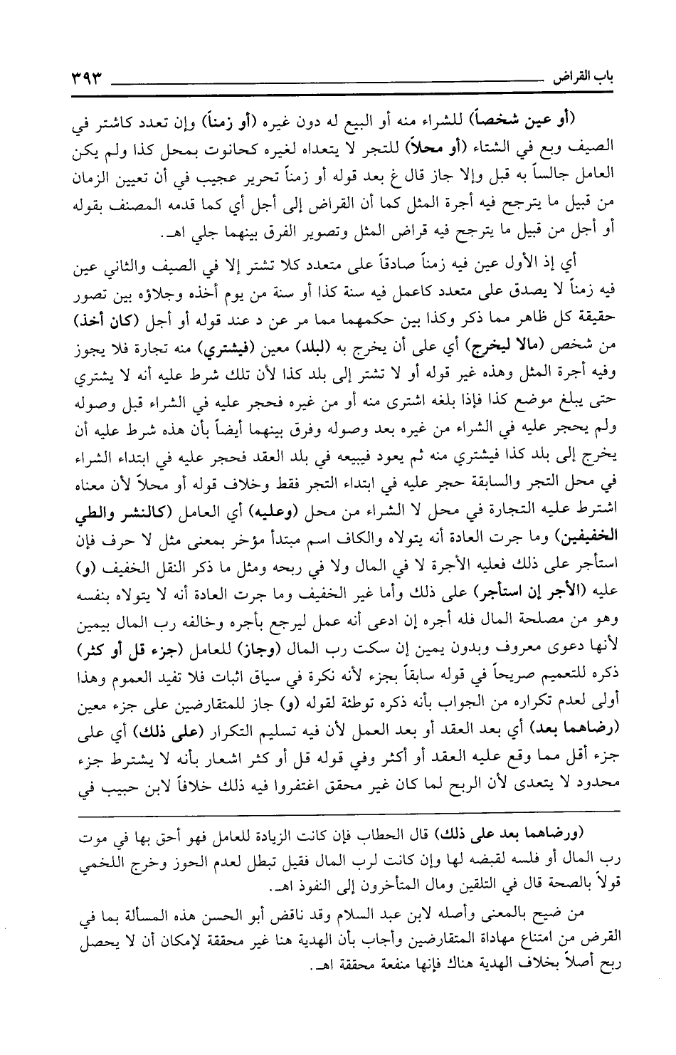 (أو عين شخصًا) للشراء منه أو البيع له دون غيره (أو زمنًا) وإن تعدد كاشتر في الصيف وبع في الشتاء (أو محلًا) للتجر لا يتعداه لغيره كحانوت بمحل كذا ولم يكن العامل جالسًا به قبل وإلا جاز قال غ بعد قوله أو زمنًا تحرير عجيب في أن تعيين الزمان من قبيل ما يترجح فيه أجرة المثل كما أن القراض إلى أجل أي كما قدمه المصنف بقوله أو أجل من قبيل ما يترجح فيه قراض المثل وتصوير الفرق بينهما جلي اهـ.