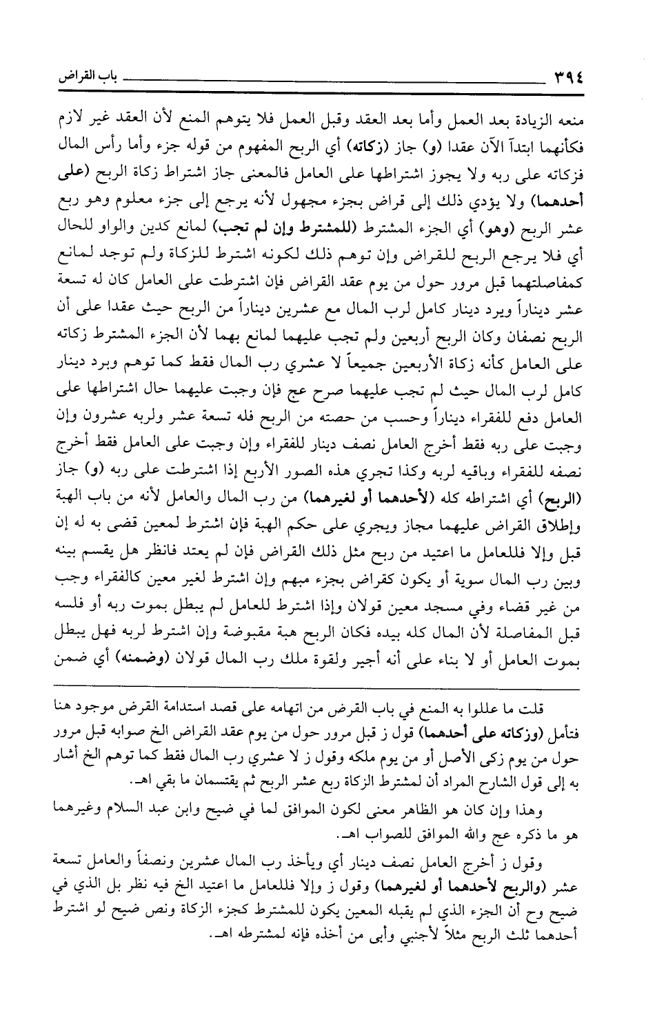 قلت ما عللوا به المنع في باب القرض من اتهامه على قصد استدامة القرض موجود هنا فتأمل (وزكاته على أحدهما) قول ز قبل مرور حول من يوم عقد القراض الخ صوابه قبل مرور حول من يوم زكى الأصل أو من يوم ملكه وقول ز لا عشري رب المال فقط كما توهم الخ أشار به إلى قول الشارح المراد أن لمشترط الزكاة ربع عشر الربح ثم يقتسمان ما بقي اهـ.