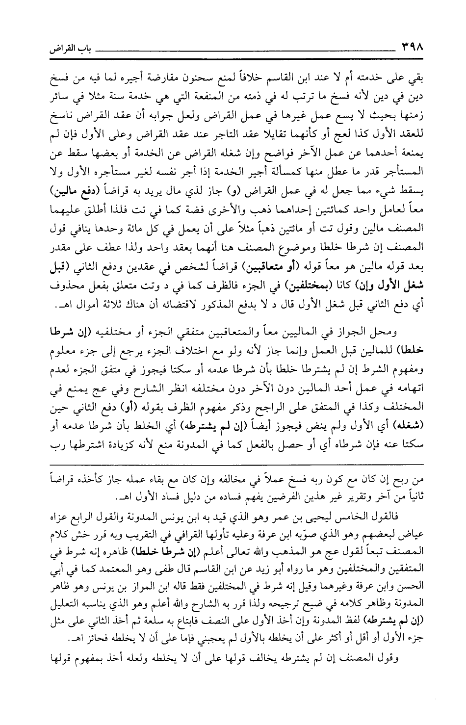 ومحل الجواز في الماليين معًا والمتعاقبين متفقي الجزء أو مختلفيه (إن شرطا خلطا) للمالين قبل العمل وإنما جاز لأنه ولو مع اختلاف الجزء يرجع إلى جزء معلوم ومفهوم الشرط إن لم يشترطا خلطا بأن شرطا عدمه أو سكتا فيجوز في متفق الجزء لعدم اتهامه في عمل أحد المالين دون الآخر دون مختلفه انظر الشارح وفي عج يمنع في المختلف وكذا في المتفق على الراجح وذكر مفهوم الظرف بقوله (أو) دفع الثاني حين (شغله) أي الأول ولم ينض فيجوز أيضًا (إن لم يشترطه) أي الخلط بأن شرطا عدمه أو سكتا عنه فإن شرطاه أي أو حصل بالفعل كما في المدونة منع لأنه كزيادة اشترطها رب