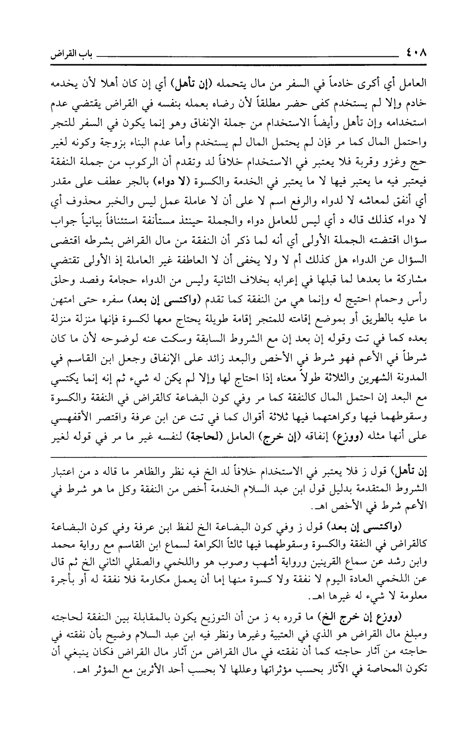 العامل أي أكرى خادمًا في السفر من مال يتحمله (إن تأهل) أي إن كان أهلا لأن يخدمه خادم وإلا لم يستخدم كفى حضر مطلقًا لأن رضاه بعمله بنفسه في القراض يقتضي عدم استخدامه وإن تأهل وأيضًا الاستخدام من جملة الإنفاق وهو إنما يكون في السفر للتجر واحتمل المال كما مر فإن لم يحتمل المال لم يستخدم وأما عدم البناء بزوجة وكونه لغير حج وغزو وقربة فلا يعتبر في الاستخدام خلافًا لد وتقدم أن الركوب من جملة النفقة فيعتبر فيه ما يعتبر فيها لا ما يعتبر في الخدمة والكسوة (لا دواء) بالجر عطف على مقدر أي أنفق لمعاشه لا لدواء والرفع اسم لا على أن لا عاملة عمل ليس والخبر محذوف أي لا دواء كذلك قاله د أي ليس للعامل دواء والجملة حينئذ مستأنفة استئنافًا بيانيًّا جواب سؤال اقتضته الجملة الأولى أي أنه لما ذكر أن النفقة من مال القراض بشرطه اقتضى السؤال عن الدواء هل كذلك أم لا ولا يخفى أن لا العاطفة غير العاملة إذ الأولى تقتضي مشاركة ما بعدها لما قبلها في إعرابه بخلاف الثانية وليس من الدواء حجامة وفصد وحلق رأس وحمام احتيج له وإنما هي من النفقة كما تقدم (واكتسى إن بعد) سفره حتى امتهن ما عليه بالطريق أو بموضع إقامته للمتجر إقامة طويلة يحتاج معها لكسوة فإنها منزلة منزلة بعده كما في تت وقوله إن بعد إن مع الشروط السابقة وسكت عنه لوضوحه لأن ما كان شرطًا في الأعم فهو شرط في الأخص والبعد زائد على الإنفاق وجعل ابن القاسم في المدونة الشهرين والثلاثة طولًا معناه إذا احتاج لها وإلا لم يكن له شيء ثم إنه إنما يكتسي مع البعد إن احتمل المال كالنفقة كما مر وفي كون البضاعة كالقراض في النفقة والكسوة وسقوطهما فيها وكراهتهما فيها ثلاثة أقوال كما في تت عن ابن عرفة واقتصر الأقفهسي على أنها مثله (ووزع) إنفاقه (إن خرج) العامل (لحاجة) لنفسه غير ما مر في قوله لغير