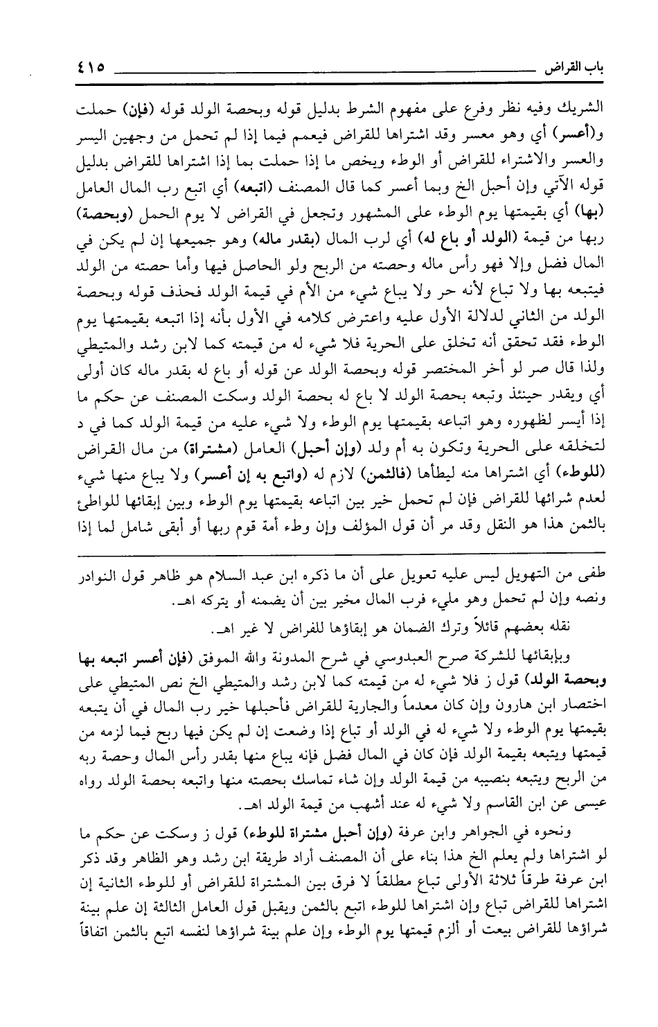وبإبقائها للشركة صرح العبدوسي في شرح المدونة والله الموفق (فإن أعسر اتبعه بها وبحصة الولد) قول ز فلا شيء له من قيمته كما لابن رشد والمتيطي الخ نص المتيطي على اختصار ابن هارون وإن كان معدمًا والجارية للقراض فأحبلها خير رب المال في أن يتبعه بقيمتها يوم الوطء ولا شيء له في الولد أو تباع إذا وضعت إن لم يكن فيها ربح فيما لزمه من قيمتها ويتبعه بقيمة الولد فإن كان في المال فضل فإنه يباع منها بقدر رأس المال وحصة ربه من الربح ويتبعه بنصيبه من قيمة الولد وإن شاء تماسك بحصته منها واتبعه بحصة الولد رواه عيسى عن ابن القاسم ولا شيء له عند أشهب من قيمة الولد اهـ.