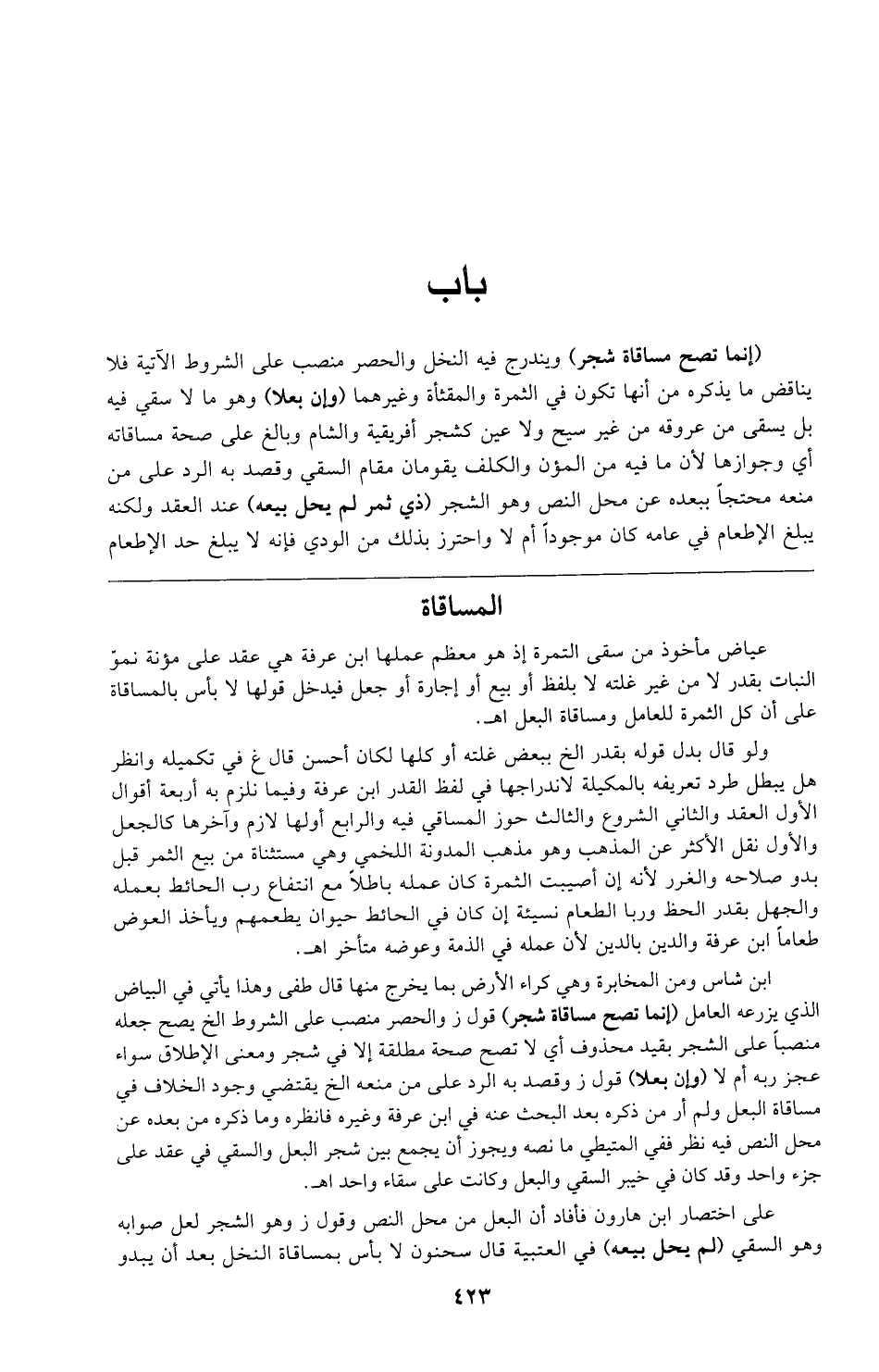 عياض مأخوذ من سقى التمرة إذ هو معظم عملها ابن عرفة هي عقد على مؤنة نموّ النبات بقدر لا من غير غلته لا بلفظ أو بيع أو إجارة أو جعل فيدخل قولها لا بأس بالمساقاة على أن كل الثمرة للعامل ومساقاة البعل اهـ.