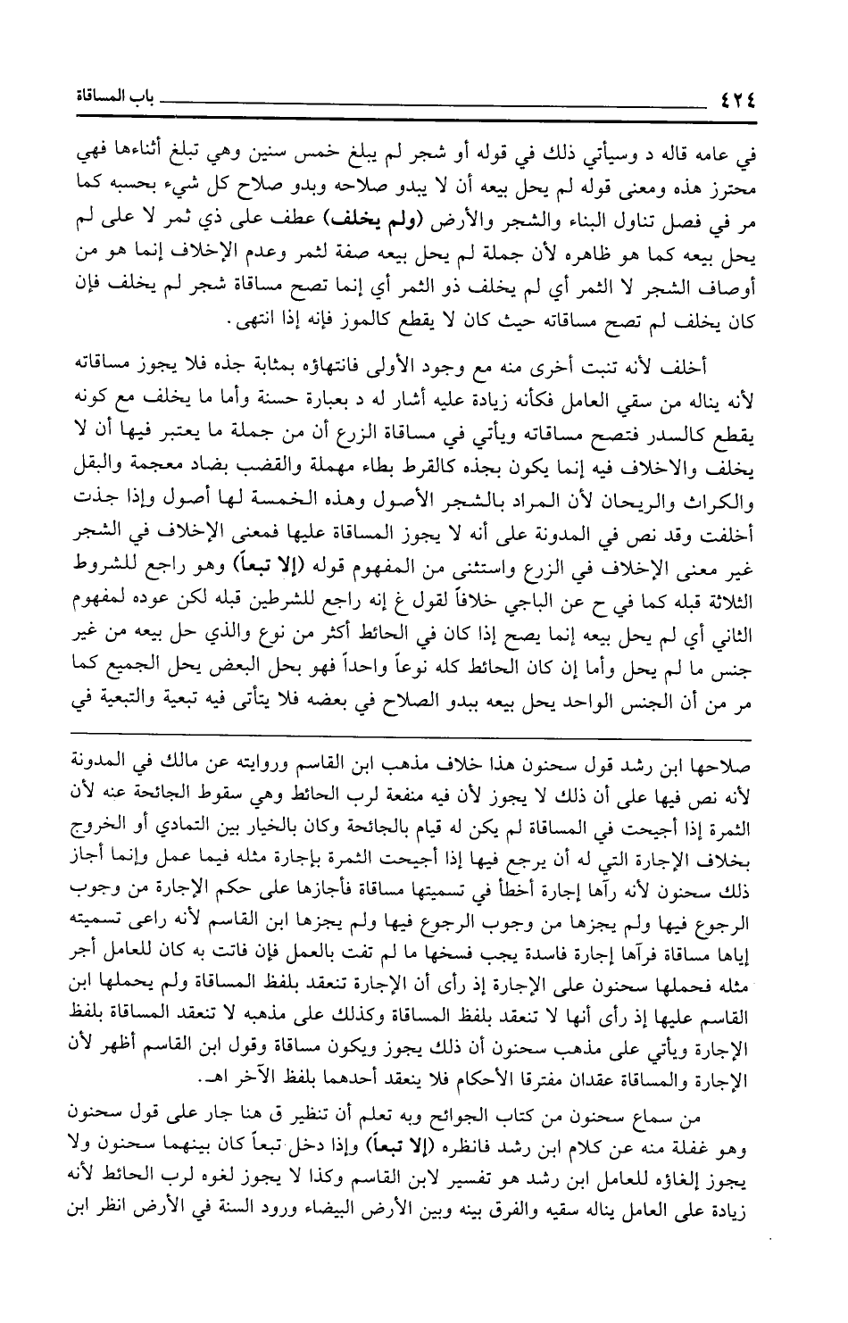 صلاحها ابن رشد قول سحنون هذا خلاف مذهب ابن القاسم وروايته عن مالك في المدونة لأنه نص فيها على أن ذلك لا يجوز لأن فيه منفعة لرب الحائط وهي سقوط الجائحة عنه لأن الثمرة إذا أجيحت في المساقاة لم يكن له قيام بالجائحة وكان بالخيار بين التمادي أو الخروج بخلاف الإجارة التي له أن يرجع فيها إذا أجيحت الثمرة بإجارة مثله فيما عمل وإنما أجاز ذلك سحنون لأنه رآها إجارة أخطأ في تسميتها مساقاة فأجازها على حكم الإجارة من وجوب الرجوع فيها ولم يجزها من وجوب الرجوع فيها ولم يجزها ابن القاسم لأنه راعى تسميته إياها مساقاة فرآها إجارة فاسدة يجب فسخها ما لم تفت بالعمل فإن فاتت به كان للعامل أجر مثله فحملها سحنون على الإجارة إذ رأى أن الإجارة تنعقد بلفظ المساقاة ولم يحملها ابن القاسم عليها إذ رأى أنها لا تنعقد بلفظ المساقاة وكذلك على مذهبه لا تنعقد المساقاة بلفظ الإجارة ويأتي على مذهب سحنون أن ذلك يجوز ويكون مساقاة وقول ابن القاسم أظهر لأن الإجارة والمساقاة عقدان مفترقا الأحكام فلا ينعقد أحدهما بلفظ الآخر اهـ.
