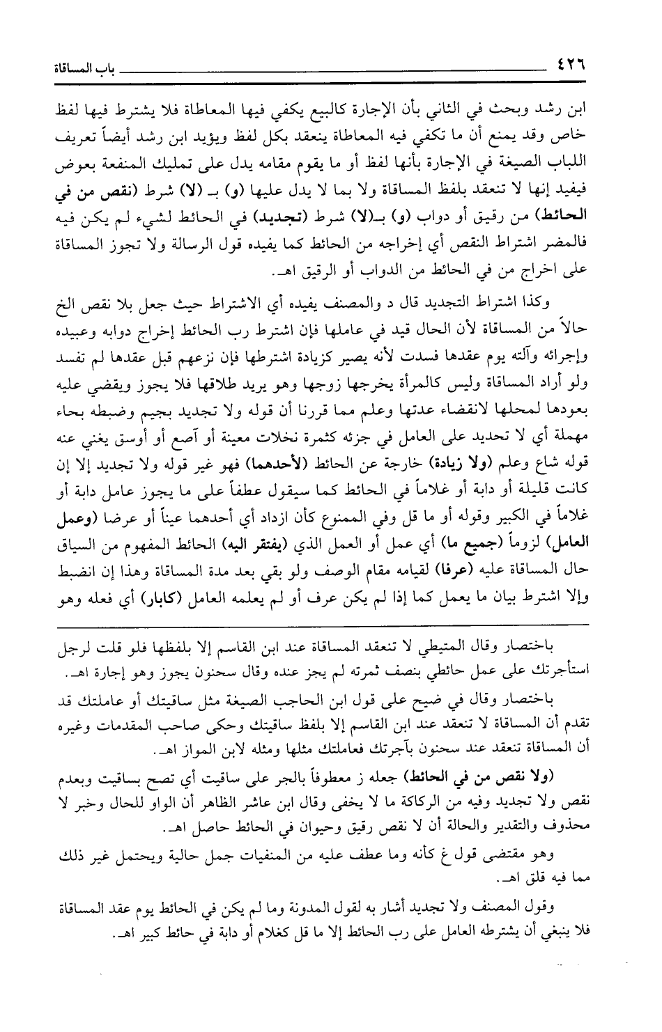 ابن رشد وبحث في الثاني بأن الإجارة كالبيع يكفي فيها المعاطاة فلا يشترط فيها لفظ خاص وقد يمنع أن ما تكفي فيه المعاطاة ينعقد بكل لفظ ويؤيد ابن رشد أيضًا تعريف اللباب الصيغة في الإجارة بأنها لفظ أو ما يقوم مقامه يدل على تمليك المنفعة بعوض فيفيد إنها لا تنعقد بلفظ المساقاة ولا بما لا يدل عليها (و) بـ (لا) شرط (نقص من في الحائط) من رقيق أو دواب (و) بـ (لا) شرط (تجديد) في الحائط لشيء لم يكن فيه فالمضر اشتراط النقص أي إخراجه من الحائط كما يفيده قول الرسالة ولا تجوز المساقاة على إخراج من في الحائط من الدواب أو الرقيق اهـ.