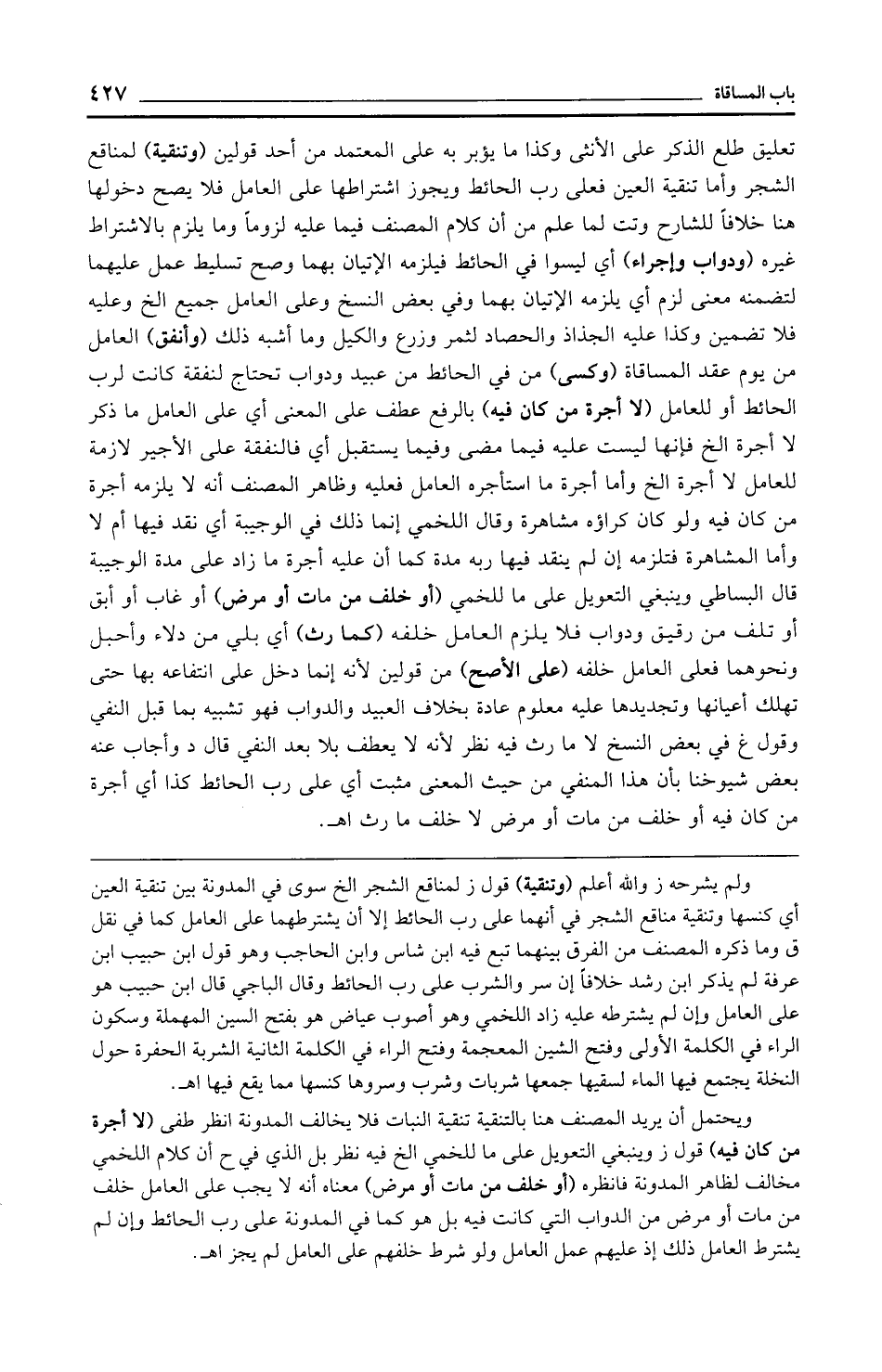 ويحتمل أن يريد المصنف هنا بالتنقية تنقية النبات فلا يخالف المدونة انظر طفى (لا أجرة من كان فيه) قول ز وينبغي التعويل على ما للخمي الخ فيه نظر بل الذي في ح أن كلام اللخمي مخالف لظاهر المدونة فانظره (أو خلف من مات أو مرض) معناه أنه لا يجب على العامل خلف من مات أو مرض من الدواب التي كانت فيه بل هو كما في المدونة على رب الحائط وإن لم يشترط العامل ذلك إذ عليهم عمل العامل ولو شرط خلفهم على العامل لم يجز اهـ.