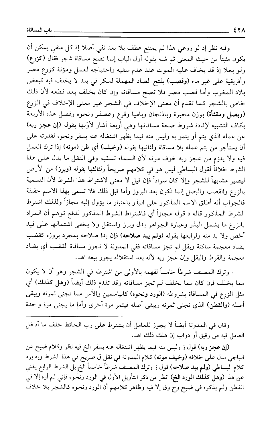 (إن عجز ربه) قول ز وليس منه فيما يظهر اشتغاله عنه بسفر الخ فيه نظر وكلام ضيح عن الباجي يدل على خلافه (وخيف موته) كلام المدونة في نقل ق صريح في هذا الشرط وبه يرد كلام البساطي (ولم يبد صلاحه) قول ز وترك المصنف شرطًا خامسًا الخ بل الشرط الرابع يغني عن هذا (وهل كذلك الورد الخ) انظر من ذكر التأويل الأول في الورد ونحوه فإني لم أره إلا في القطن ولم يذكره في ضيح وح وق إلا فيه وظاهر كلامهم أن الورد ونحوه كالشجر بلا خلاف