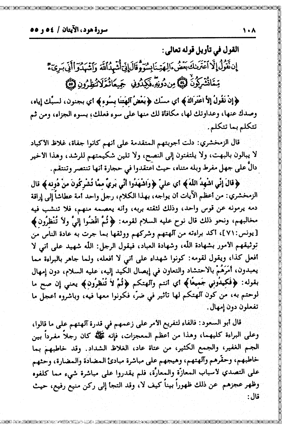 إِنْ نَقُولُ إِلاَّ اعْتَراكَ بَعْضُ آلِهَتِنا بِسُوءٍ قالَ إِنِّي أُشْهِدُ اللَّهَ وَاشْهَدُوا أَنِّي بَرِيءٌ مِمَّا تُشْرِكُونَ (54) مِنْ دُونِهِ فَكِيدُونِي جَمِيعاً ثُمَّ لا تُنْظِرُونِ (55)