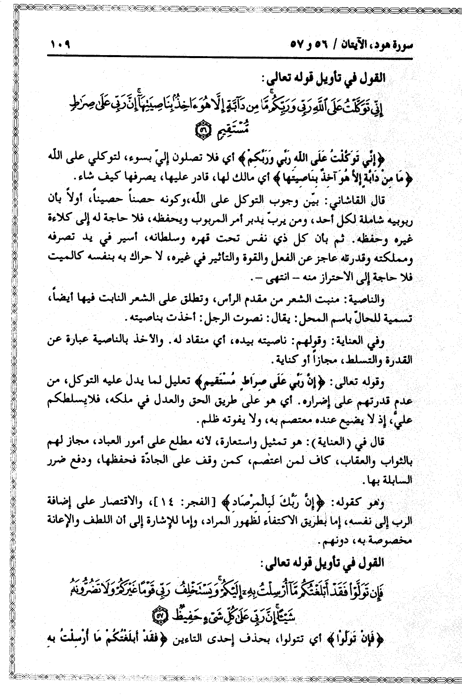 إِنِّي تَوَكَّلْتُ عَلَى اللَّهِ رَبِّي وَرَبِّكُمْ ما مِنْ دَابَّةٍ إِلاَّ هُوَ آخِذٌ بِناصِيَتِها إِنَّ رَبِّي عَلى صِراطٍ مُسْتَقِيمٍ (56)