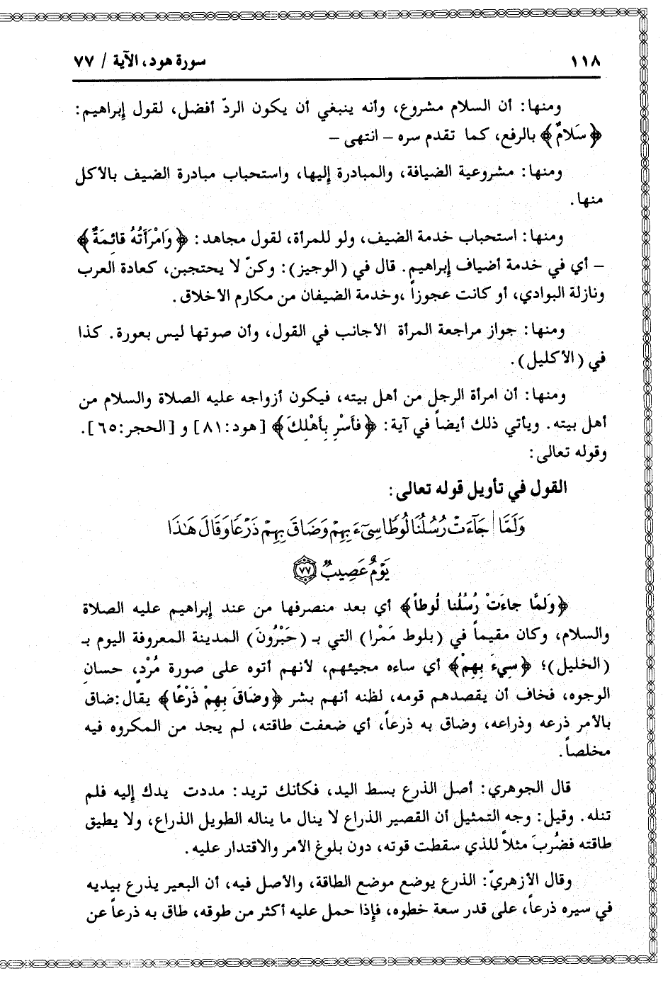 وَلَمَّا جاءَتْ رُسُلُنا لُوطاً أي بعد منصرفها من عند إبراهيم عليه الصلاة والسلام، وكان مقيما في (بلوط ممرا) التي ب (حبرون) المدينة المعروفة اليوم ب (الخليل) سِيءَ بِهِمْ أي ساءه مجيئهم، لأنهم أتوه على صورة مرد، حسان الوجوه، فخاف أن يقصدهم قومه، لظنه أنهم بشر وَضاقَ بِهِمْ ذَرْعاً يقال: ضاق بالأمر ذرعه وذراعه، وضاق به ذرعا، أي ضعفت طاقته، لم يجد من المكروه فيه مخلصا.