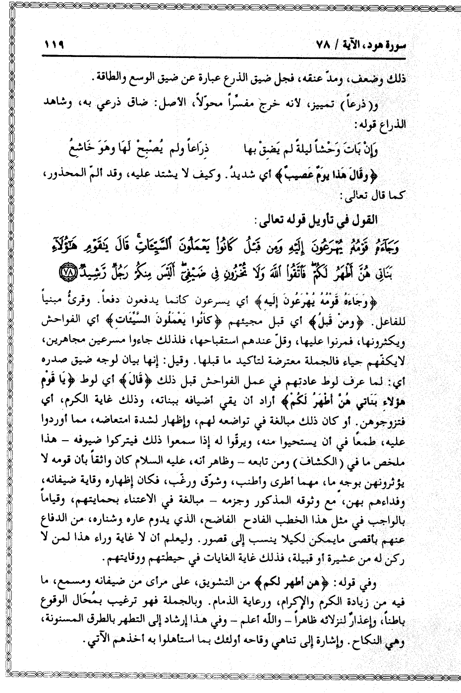 وَجاءَهُ قَوْمُهُ يُهْرَعُونَ إِلَيْهِ وَمِنْ قَبْلُ كانُوا يَعْمَلُونَ السَّيِّئاتِ قالَ يا قَوْمِ هؤُلاءِ بَناتِي هُنَّ أَطْهَرُ لَكُمْ فَاتَّقُوا اللَّهَ وَلا تُخْزُونِ فِي ضَيْفِي أَلَيْسَ مِنْكُمْ رَجُلٌ رَشِيدٌ (78)