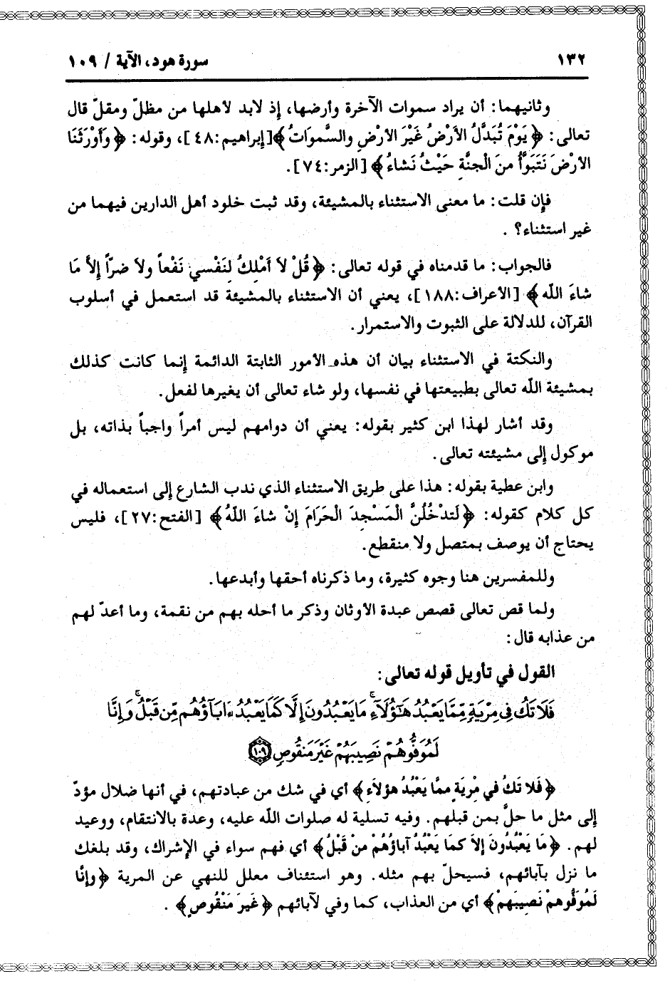 فَلا تَكُ فِي مِرْيَةٍ مِمَّا يَعْبُدُ هؤُلاءِ ما يَعْبُدُونَ إِلاَّ كَما يَعْبُدُ آباؤُهُمْ مِنْ قَبْلُ وَإِنَّا لَمُوَفُّوهُمْ نَصِيبَهُمْ غَيْرَ مَنْقُوصٍ (109)