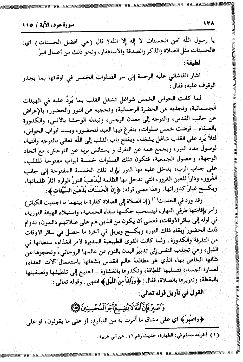 لما كانت الحواس الخمس شواغل تشغل القلب بما يرد عليه في الهيئات الجسمانية، وتجذبه عن الحضرة الرحمانية، وتحجبه عن النور والحضور، بالإعراض عن جانب القدس، والتوجه إلى معدن الرجس، وتبدله الوحشة بالأنس، والكدورة بالصفاء- فرضت خمس صلوات، يتفرغ فيها العبد للحضور، ويسد أبواب الحواس، لئلا يرد على القلب شاغل يشغله، ويفتح باب القلب إلى الله تعالى بالتوجه والنية، لوصول مدد النور، ويجمع همه عن التفرق ويستأنس بربه عن التوحش، مع اتحاد الوجهة، وحصول الجمعية، فتكون تلك الصلوات خمسة أبواب مفتوحة للقلب، على جناب الرب، يدخل عليه بها النور بإزاء تلك الخمسة المفتوحة إلى جانب الغرور، ودارا للعين الغرور، التي تدخل بها الظلمة ليذهب النور الوارد أثار ظلماتها، ويكسح غبار كدوراتها. وهذا معنى قوله: إِنَّ الْحَسَناتِ يُذْهِبْنَ السَّيِّئاتِ: