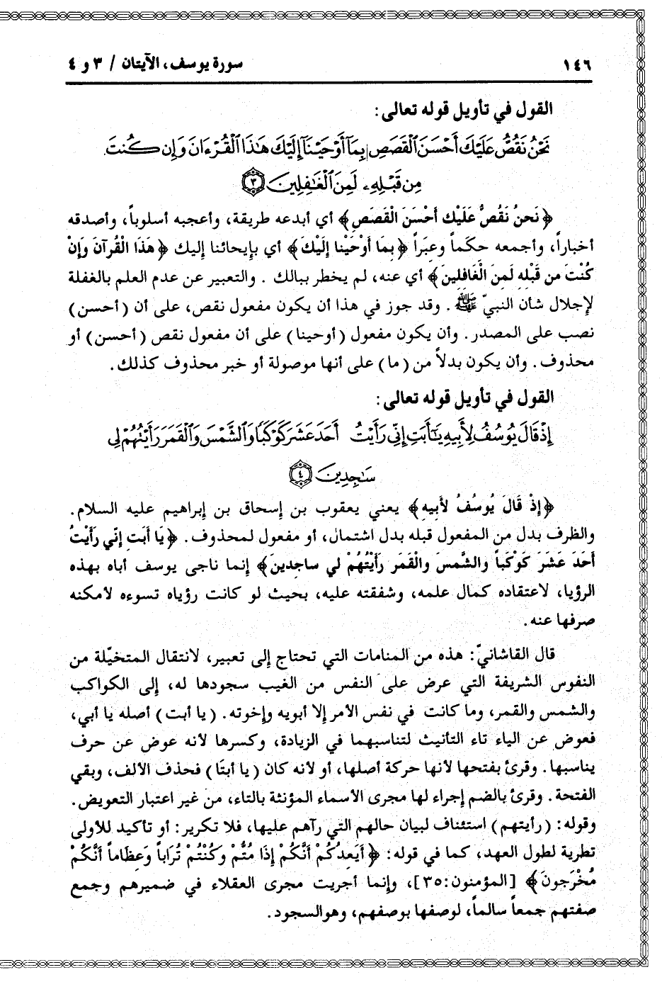نَحْنُ نَقُصُّ عَلَيْكَ أَحْسَنَ الْقَصَصِ أي أبدعه طريقة، وأعجبه أسلوبا، وأصدقه أخبارا، وأجمعه حكما وعبرا بِما أَوْحَيْنا إِلَيْكَ أي بإيحائنا إليك هذَا الْقُرْآنَ وَإِنْ كُنْتَ مِنْ قَبْلِهِ لَمِنَ الْغافِلِينَ أي عنه، لم يخطر ببالك. والتعبير عن عدم العلم بالغفلة لإجلال شأن النبيّ صلى الله عليه وسلم. وقد جوز في هذا أن يكون مفعول نقص، على أن (أحسن) نصب على المصدر. وأن يكون مفعول (أوحينا) على أن مفعول نقص (أحسن) أو محذوف. وأن يكون بدلا من (ما) على أنها موصولة أو خبر محذوف كذلك.