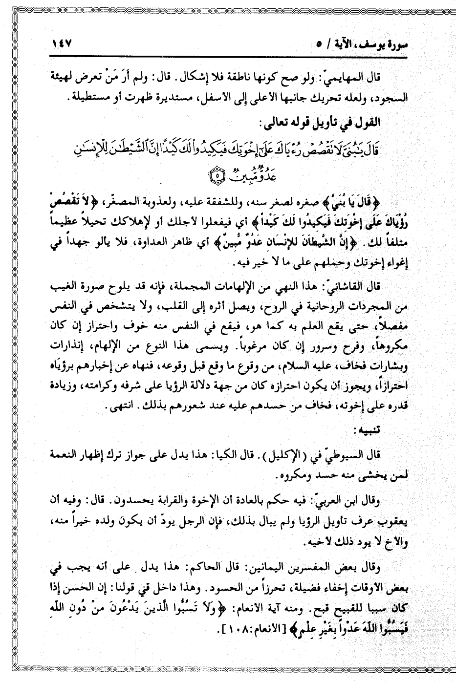 قالَ يا بُنَيَّ لا تَقْصُصْ رُؤْياكَ عَلى إِخْوَتِكَ فَيَكِيدُوا لَكَ كَيْداً إِنَّ الشَّيْطانَ لِلْإِنْسانِ عَدُوٌّ مُبِينٌ (5)