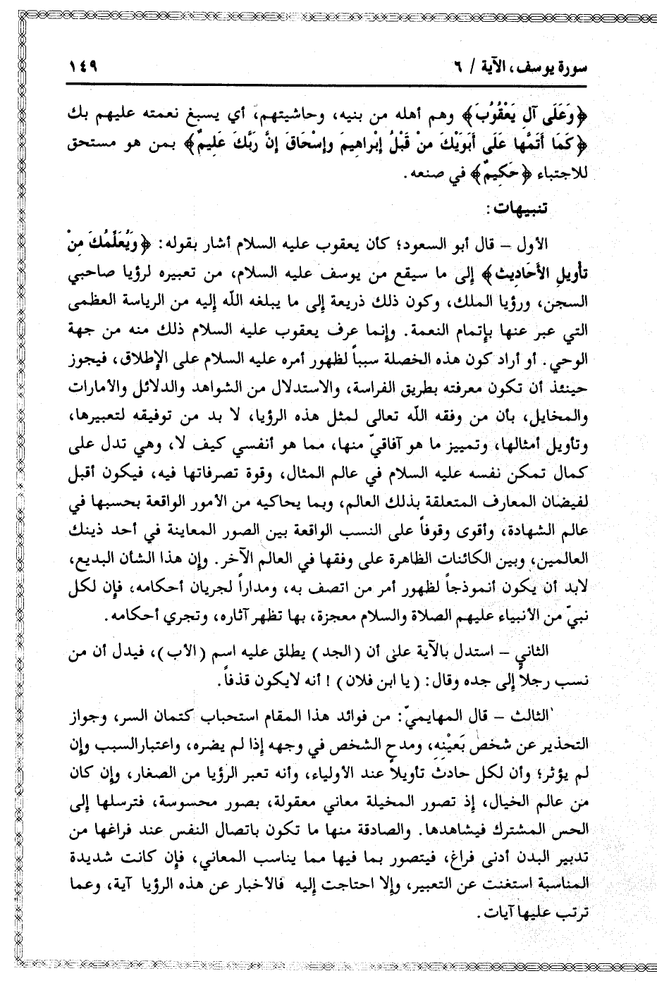 الأول- قال أبو السعود كأن يعقوب عليه السلام أشار بقوله: وَيُعَلِّمُكَ مِنْ تَأْوِيلِ الْأَحادِيثِ إلى ما سيقع من يوسف عليه السلام، من تعبيره لرؤيا صاحبي السجن، ورؤيا الملك، وكون ذلك ذريعة إلى ما يبلغه الله إليه من الرياسة العظمى التي عبر عنها بإتمام النعمة. وإنما عرف يعقوب عليه السلام ذلك منه من جهة الوحي. أو أراد كون هذه الخصلة سببا لظهور أمره عليه السلام على الإطلاق، فيجوز حينئذ أن تكون معرفته بطريق الفراسة، والاستدلال من الشواهد والدلائل والأمارات والمخايل، بأن من وفقه الله تعالى لمثل هذه الرؤيا، لا بد من توفيقه لتعبيرها، وتأويل أمثالها، وتمييز ما هو آفاقيّ منها، مما هو أنفسي كيف لا، وهي تدل على كمال تمكن نفسه عليه السلام في عالم المثال، وقوة تصرفاتها فيه، فيكون أقبل لفيضان المعارف المتعلقة بذلك العالم، وبما يحاكيه من الأمور الواقعة بحسبها في عالم الشهادة، وأقوى وقوفا على النسب الواقعة بين الصور المعاينة في أحد ذينك العالمين، وبين الكائنات الظاهرة على وفقها في العالم الآخر. وإن هذا الشأن البديع، لا بد أن يكون أنموذجا لظهور أمر من اتصف به، ومدارا لجريان أحكامه، فإن لك نبيّ من الأنبياء عليهم الصلاة والسلام معجزة، بها تظهر آثاره، وتجري أحكامه.