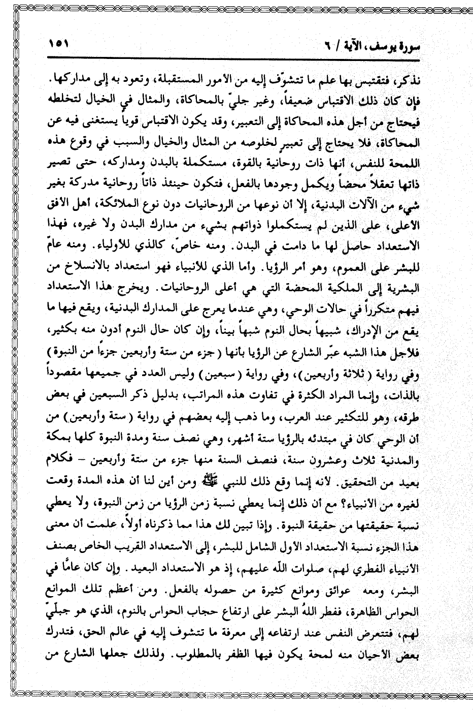 فإن كان ذلك الاقتباس ضعيفا، وغير جليّ بالمحاكاة، والمثال في الخيال لتخلطه فيحتاج من أجل هذه المحاكاة إلى التعبير، وقد يكون الاقتباس قويا يستغنى فيه عن المحاكاة، فلا يحتاج إلى تعبير لخلوصه من المثال والخيال والسبب في وقوع هذه اللمحة للنفس، أنها ذات روحانية بالقوة، مستكملة بالبدن ومداركه، حتى تصير ذاتها تعقلا محضا ويكمل وجودها بالفعل، فتكون حينئذ ذاتا روحانية مدركة بغير شيء من الآلات البدنية، إلا أن نوعها من الروحانيات دون الملائكة، أهل الأفق الأعلى، على الذين لم يستكملوا ذواتهم بشيء من مدارك البدن ولا غيره، فهذا الاستعداد حاصل لها ما دامت في البدن. ومنه خاصّ، كالذي للأولياء. ومنه عامّ للبشر على العموم، وهو أمر الرؤيا. وأما الذي للأنبياء فهو استعداد بالانسلاخ من البشرية إلى الملكية المحضة التي هي أعلى الروحانيات. ويخرج هذا الاستعداد فيهم متكررا في حالات الوحي، وهي عند ما يعرج على المدارك البدنية، ويقع فيها ما يقع من الإدراك، شبيها بحال النوم شبها بينا، وإن كان حال النوم أدون منه بكثير، فلأجل هذا الشبه عبّر الشارع عن الرؤيا بأنها