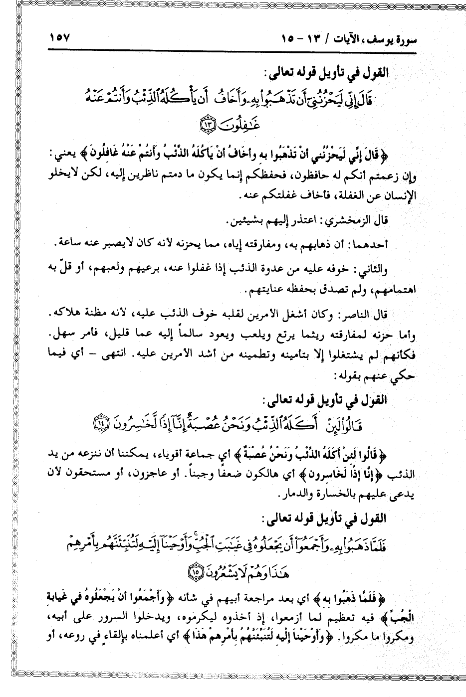 قالَ إِنِّي لَيَحْزُنُنِي أَنْ تَذْهَبُوا بِهِ وَأَخافُ أَنْ يَأْكُلَهُ الذِّئْبُ وَأَنْتُمْ عَنْهُ غافِلُونَ (13)