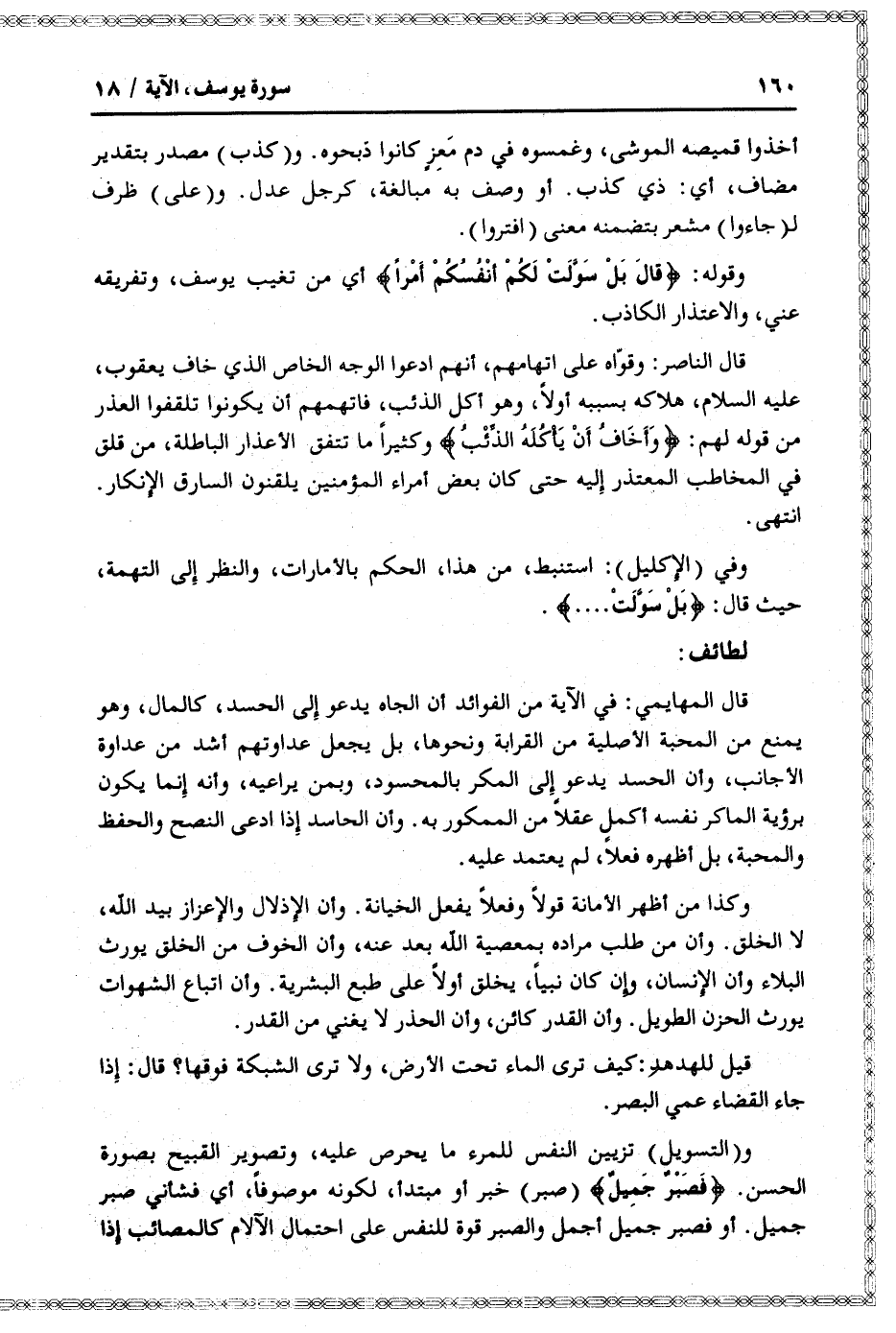 و (التسويل) تزيين النفس للمرء ما يحرص عليه، وتصوير القبيح بصورة الحسن. فَصَبْرٌ جَمِيلٌ (صبر) خبر أو مبتدأ، لكونه موصوفا، أي فشأني صبر جميل. أو فصبر جميل أجمل والصبر قوة للنفس على احتمال الآلام كالمصائب إذا