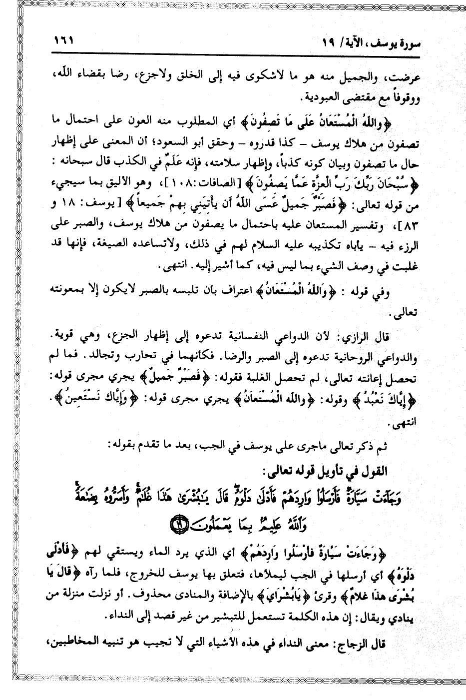 وَجاءَتْ سَيَّارَةٌ فَأَرْسَلُوا وارِدَهُمْ فَأَدْلى دَلْوَهُ قالَ يا بُشْرى هذا غُلامٌ وَأَسَرُّوهُ بِضاعَةً وَاللَّهُ عَلِيمٌ بِما يَعْمَلُونَ (19)