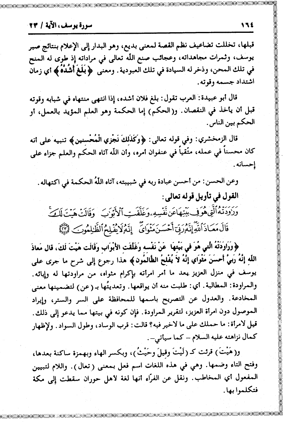 وَراوَدَتْهُ الَّتِي هُوَ فِي بَيْتِها عَنْ نَفْسِهِ وَغَلَّقَتِ الْأَبْوابَ وَقالَتْ هَيْتَ لَكَ، قالَ مَعاذَ اللَّهِ إِنَّهُ رَبِّي أَحْسَنَ مَثْوايَ إِنَّهُ لا يُفْلِحُ الظَّالِمُونَ هذا رجوع إلى شرح ما جرى على يوسف في منزل العزيز بعد ما أمر امرأته بإكرام مثواه، من مراودتها له وإبائه.
