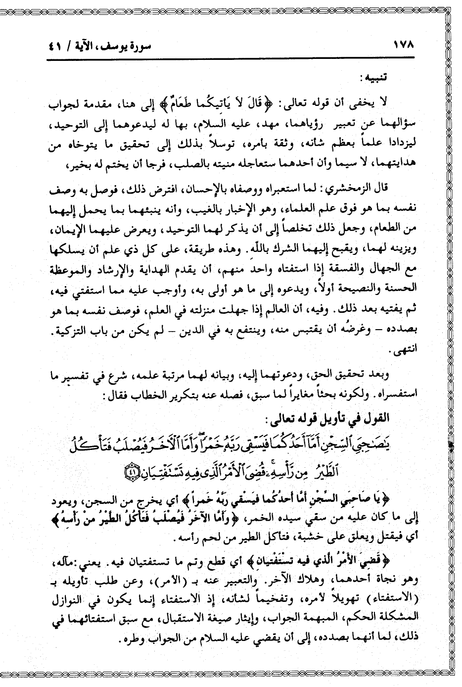 يا صاحِبَيِ السِّجْنِ أَمَّا أَحَدُكُما فَيَسْقِي رَبَّهُ خَمْراً وَأَمَّا الْآخَرُ فَيُصْلَبُ فَتَأْكُلُ الطَّيْرُ مِنْ رَأْسِهِ قُضِيَ الْأَمْرُ الَّذِي فِيهِ تَسْتَفْتِيانِ (41)