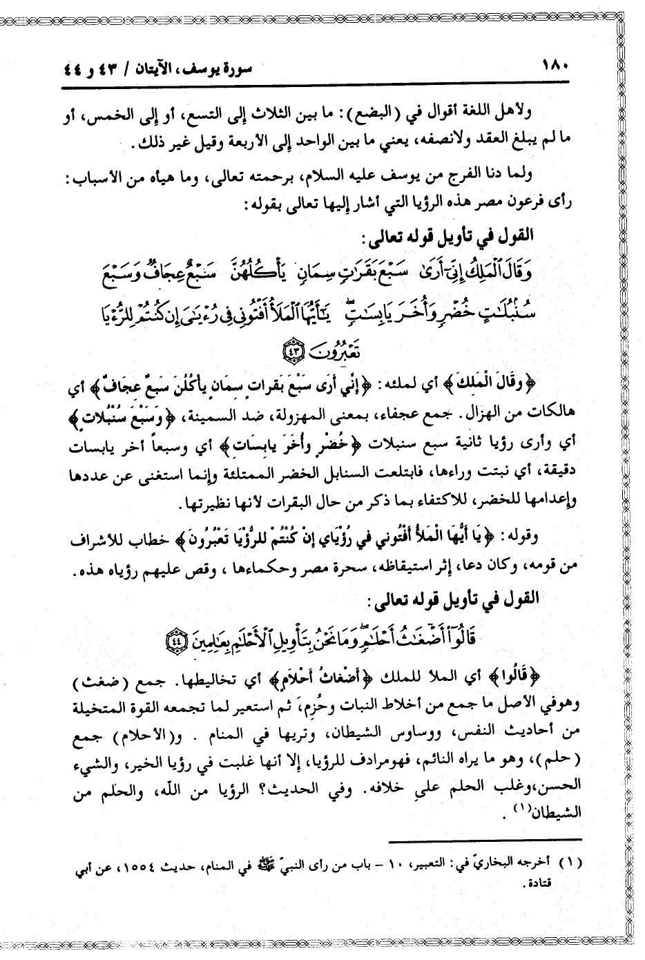 وَقالَ الْمَلِكُ إِنِّي أَرى سَبْعَ بَقَراتٍ سِمانٍ يَأْكُلُهُنَّ سَبْعٌ عِجافٌ وَسَبْعَ سُنْبُلاتٍ خُضْرٍ وَأُخَرَ يابِساتٍ يا أَيُّهَا الْمَلَأُ أَفْتُونِي فِي رُءْيايَ إِنْ كُنْتُمْ لِلرُّءْيا تَعْبُرُونَ (43)