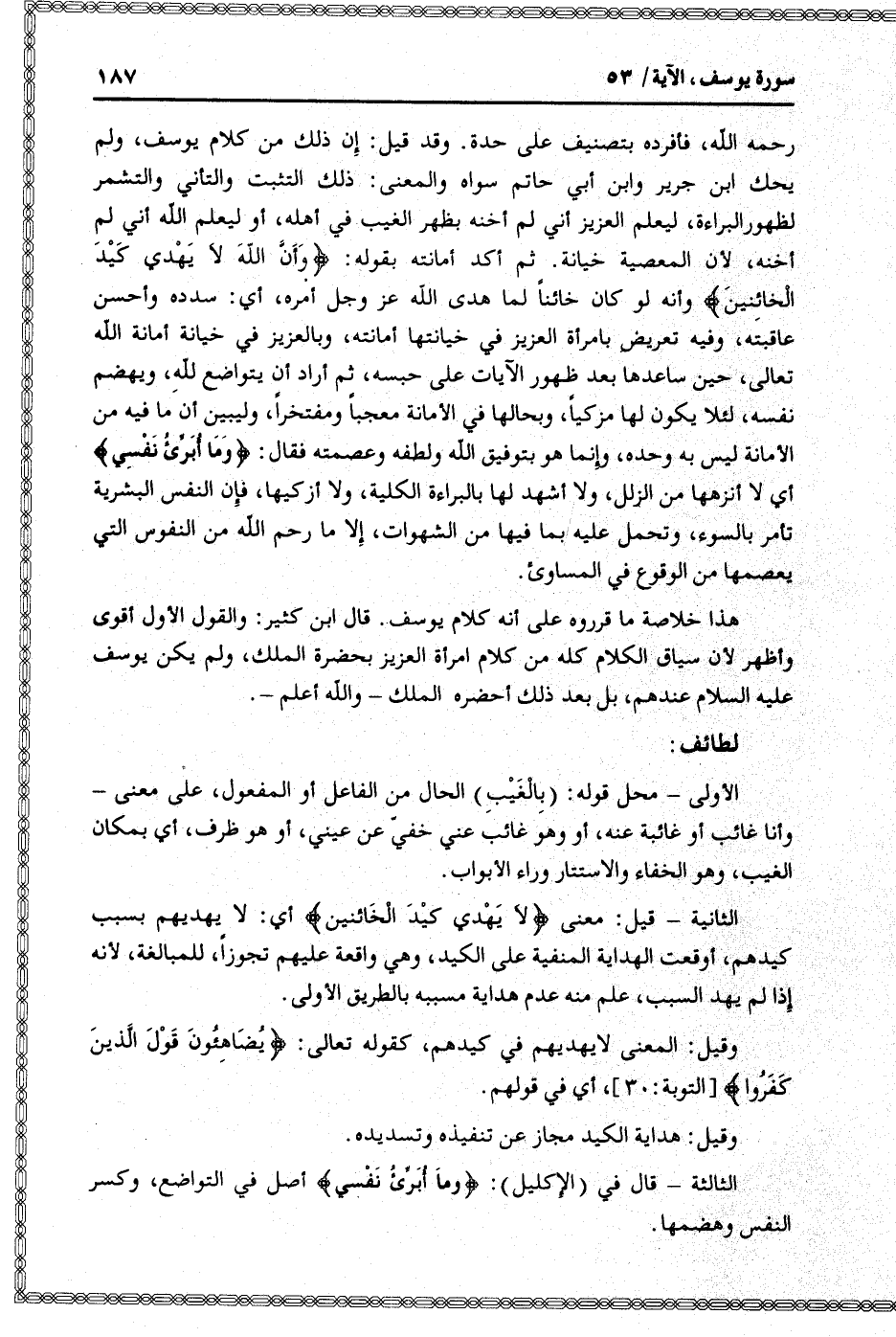رحمه الله، فأفرده بتصنيف على حدة. وقد قيل: إن ذلك من كلام يوسف، ولم يحك ابن جرير وابن أبي حاتم سواه والمعنى: ذلك التثبت والتأني والتشمر لظهور البراءة، ليعلم العزيز أني لم أخنه بظهر الغيب في أهله، أو ليعلم الله أني لم أخنه، لأن المعصية خيانة. ثم أكد أمانته بقوله: وَأَنَّ اللَّهَ لا يَهْدِي كَيْدَ الْخائِنِينَ وأنه لو كان خائنا لما هدى الله عز وجل أمره، أي: سدده وأحسن عاقبته، وفيه تعريض بامرأة العزيز في خيانتها أمانته، وبالعزيز في خيانة أمانة الله تعالى، حين ساعدها بعد ظهور الآيات على حبسه، ثم أراد أن يتواضع لله، ويهضم نفسه، لئلا يكون لها مزكيا، وبحالها في الأمانة معجبا ومفتخرا، وليبين أن ما فيه من الأمانة ليس به وحده، وإنما هو بتوفيق الله ولطفه وعصمته فقال: وَما أُبَرِّئُ نَفْسِي أي لا أنزهها من الزلل، ولا أشهد لها بالبراءة الكلية، ولا أزكيها، فإن النفس البشرية تأمر بالسوء، وتحمل عليه بما فيها من الشهوات، إلا ما رحم الله من النفوس التي يعصمها من الوقوع في المساوئ.