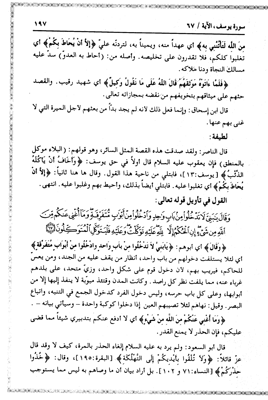 وَقالَ يا بَنِيَّ لا تَدْخُلُوا مِنْ بابٍ واحِدٍ وَادْخُلُوا مِنْ أَبْوابٍ مُتَفَرِّقَةٍ وَما أُغْنِي عَنْكُمْ مِنَ اللَّهِ مِنْ شَيْءٍ إِنِ الْحُكْمُ إِلاَّ لِلَّهِ عَلَيْهِ تَوَكَّلْتُ وَعَلَيْهِ فَلْيَتَوَكَّلِ الْمُتَوَكِّلُونَ (67)