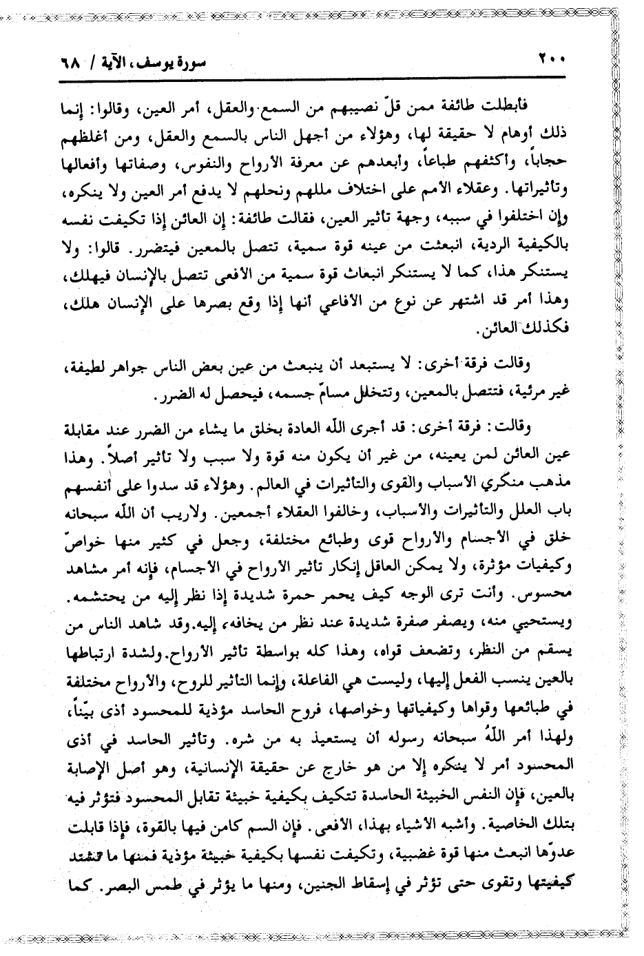 وقالت: فرقة أخرى: قد أجرى الله العادة بخلق ما يشاء من الضرر عند مقابلة عين العائن لمن يعينه، من غير أن يكون منه قوة ولا سبب ولا تأثير أصلا. وهذا مذهب منكري الأسباب والقوى والتأثيرات في العالم. وهؤلاء قد سدوا على أنفسهم باب العلل والتأثيرات والأسباب، وخالفوا العقلاء أجمعين. ولا ريب أن الله سبحانه خلق في الأجسام والأرواح قوى وطبائع مختلفة، وجعل في كثير منها خواصّ وكيفيات مؤثرة، ولا يمكن العاقل إنكار تأثير الأرواح في الأجسام، فإنه أمر مشاهد محسوس. وأنت ترى الوجه كيف يحمر حمرة شديدة إذا نظر إليه من يحتشمه.