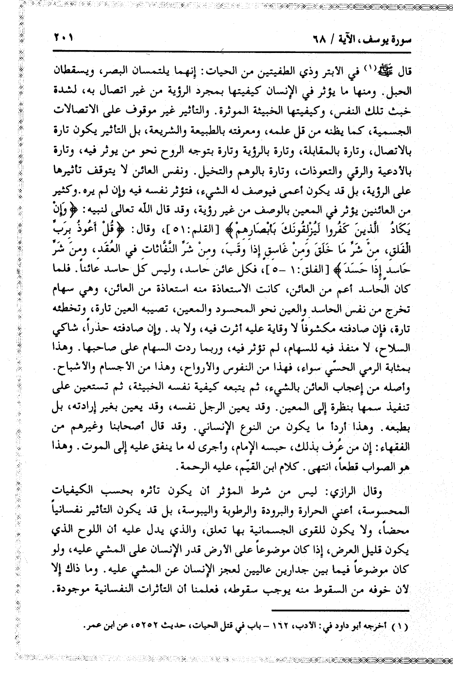 . ومنها ما يؤثر في الإنسان كيفيتها بمجرد الرؤية من غير اتصال به، لشدة خبث تلك النفس، وكيفيتها الخبيثة الموثرة. والتأثير غير موقوف على الاتصالات الجسمية، كما يظنه من قل علمه، ومعرفته بالطبيعة والشريعة، بل التأثير يكون تارة بالاتصال، وتارة بالمقابلة، وتارة بالرؤية وتارة بتوجه الروح نحو من يوثر فيه، وتارة بالأدعية والرقي والتعوذات، وتارة بالوهم والتخيل. ونفس العائن لا يتوقف تأثيرها على الرؤية، بل قد يكون أعمى فيوصف له الشيء، فتؤثر نفسه فيه وإن لم يره. وكثير من العائنين يؤثر في المعين بالوصف من غير رؤية، وقد قال الله تعالى لنبيه: وَإِنْ يَكادُ الَّذِينَ كَفَرُوا لَيُزْلِقُونَكَ بِأَبْصارِهِمْ [القلم: 51] ، وقال: قُلْ أَعُوذُ بِرَبِّ الْفَلَقِ، مِنْ شَرِّ ما خَلَقَ وَمِنْ شَرِّ غاسِقٍ إِذا وَقَبَ، وَمِنْ شَرِّ النَّفَّاثاتِ فِي الْعُقَدِ، وَمِنْ شَرِّ حاسِدٍ إِذا حَسَدَ [الفلق: 1- 5] ، فكل عائن حاسد، وليس كل حاسد عائنا. فلما كان الحاسد أعم من العائن، كانت الاستعاذة منه استعاذة من العائن، وهي سهام تخرج من نفس الحاسد والعين نحو المحسود والمعين، تصيبه العين تارة، وتخطئه تارة، فإن صادفته مكشوفا لا وقاية عليه أثرت فيه، ولا بد. وإن صادفته حذرا، شاكي السلاح، لا منفذ فيه للسهام، لم تؤثر فيه، وربما ردت السهام على صاحبها. وهذا بمثابة الرمي الحسيّ سواء، فهذا من النفوس والأرواح، وهذا من الأجسام والأشباح.