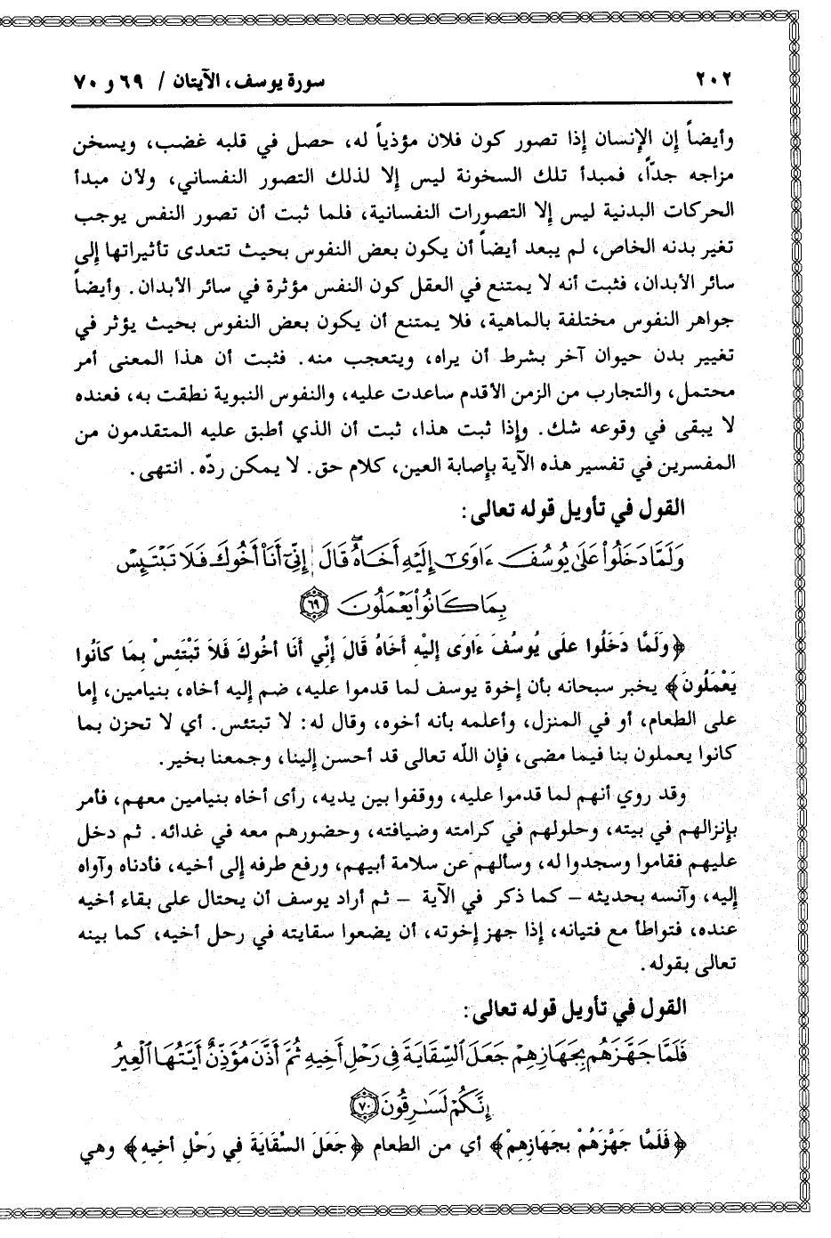 وَلَمَّا دَخَلُوا عَلى يُوسُفَ آوى إِلَيْهِ أَخاهُ قالَ إِنِّي أَنَا أَخُوكَ فَلا تَبْتَئِسْ بِما كانُوا يَعْمَلُونَ يخبر سبحانه بأن إخوة يوسف لما قدموا عليه، ضم إليه أخاه، بنيامين، إما على الطعام، أو في المنزل، وأعلمه بأنه أخوه، وقال له: لا تبتئس. أي لا تحزن بما كانوا يعملون بنا فيما مضى، فإن الله تعالى قد أحسن إلينا، وجمعنا بخير.