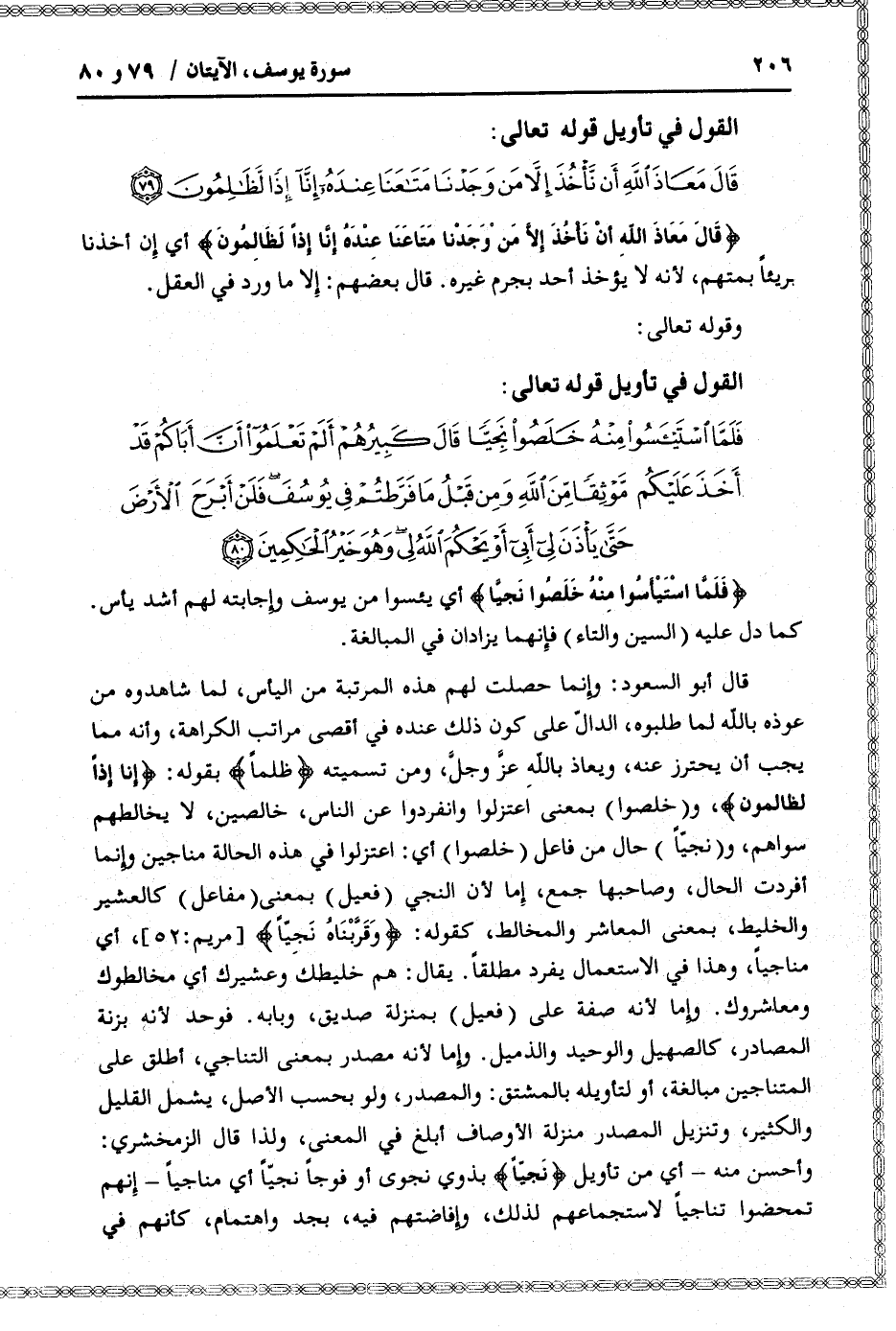 قال أبو السعود: وإنما حصلت لهم هذه المرتبة من اليأس، لما شاهدوه من عوذه بالله لما طلبوه، الدالّ على كون ذلك عنده في أقصى مراتب الكراهة، وأنه مما يجب أن يحترز عنه، ويعاذ بالله عزّ وجلّ، ومن تسميته (ظلما) بقوله: إِنَّا إِذاً لَظالِمُونَ، و (خلصوا) بمعنى اعتزلوا وانفردوا عن الناس، خالصين، لا يخالطهم سواهم، و (نجيّا) حال من فاعل (خلصوا) أي: اعتزلوا في هذه الحالة مناجين وإنما أفردت الحال، وصاحبها جمع، إما لأن النجي (فعيل) بمعنى (مفاعل) كالعشير والخليط، بمعنى المعاشر والمخالط، كقوله: وَقَرَّبْناهُ نَجِيًّا [مريم: 52] ، أي مناجيا، وهذا في الاستعمال يفرد مطلقا. يقال: هم خليطك وعشيرك أي مخالطوك ومعاشروك. وإما لأنه صفة على (فعيل) بمنزلة صديق، وبابه. فوحد لأنه بزنة المصادر، كالصهيل والوحيد والذميل. وإمّا لأنه مصدر بمعنى التناجي، أطلق على المتناجين مبالغة، أو لتأويله بالمشتق: والمصدر، ولو بحسب الأصل، يشمل القليل والكثير، وتنزيل المصدر منزلة الأوصاف أبلغ في المعنى، ولذا قال الزمخشري: