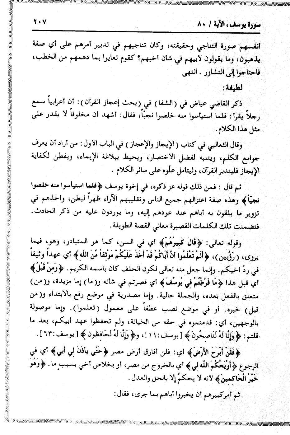 ذكر القاضي عياض في (الشفا) في (بحث إعجاز القرآن) : أن أعرابيا سمع رجلا يقرأ: فلما استيأسوا منه خلصوا نجيّا، فقال: أشهد أن مخلوقا لا يقدر على مثل هذا الكلام.