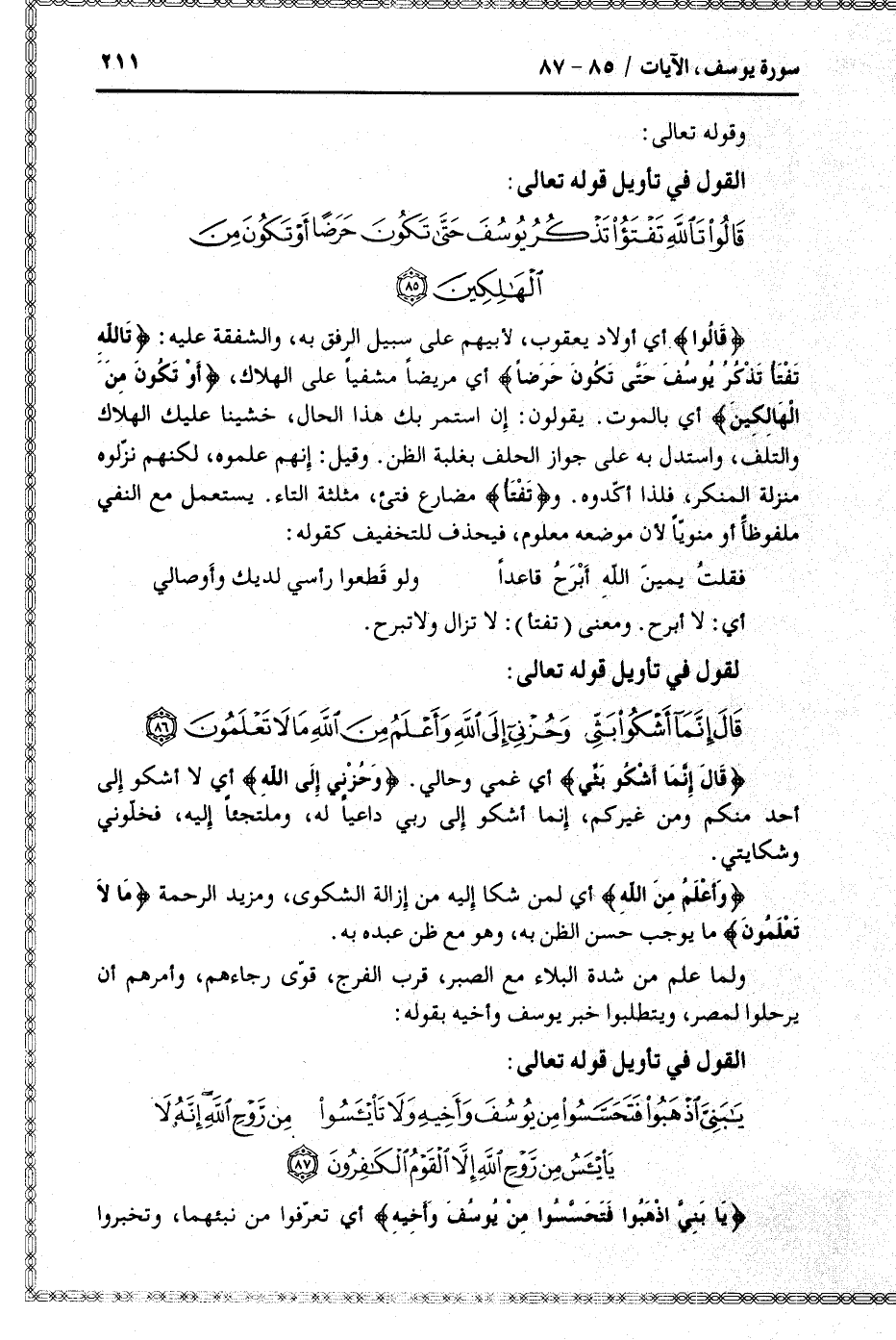 قالُوا أي أولاد يعقوب، لأبيهم على سبيل الرفق به، والشفقة عليه: تَاللَّهِ تَفْتَؤُا تَذْكُرُ يُوسُفَ حَتَّى تَكُونَ حَرَضاً أي مريضا مشفيا على الهلاك، أَوْ تَكُونَ مِنَ الْهالِكِينَ أي بالموت. يقولون: إن استمر بك هذا الحال، خشينا عليك الهلاك والتلف، واستدل به على جواز الحلف بغلبة الظن. وقيل: إنهم علموه، لكنهم نزّلوه منزلة المنكر، فلذا أكّدوه. وتَفْتَؤُا مضارع فتئ، مثلثة التاء. يستعمل مع النفي ملفوظا أو منويّا لأن موضعه معلوم، فيحذف للتخفيف كقوله: