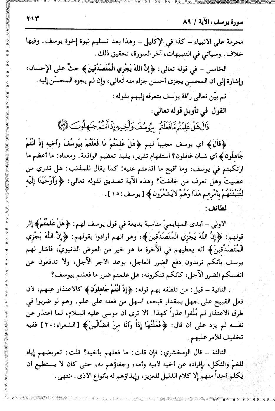 الأولى- أبدى المهايميّ مناسبة بديعة في قول يوسف لهم: هَلْ عَلِمْتُمْ إثر قولهم: إِنَّ اللَّهَ يَجْزِي الْمُتَصَدِّقِينَ، وهو أنهم أرادوا بقولهم: إِنَّ اللَّهَ يَجْزِي الْمُتَصَدِّقِينَ أنه يعطيهم في الآخرة ما هو خير من العوض الدنيويّ، فأشار لهم يوسف بأنكم تريدون دفع الضرر العاجل، بوعد الأجر الآجل، ولا تدفعون عن أنفسكم الضرر الآجل، كأنكم تنكرونه، هل علمتم ضرر ما فعلتم بيوسف؟