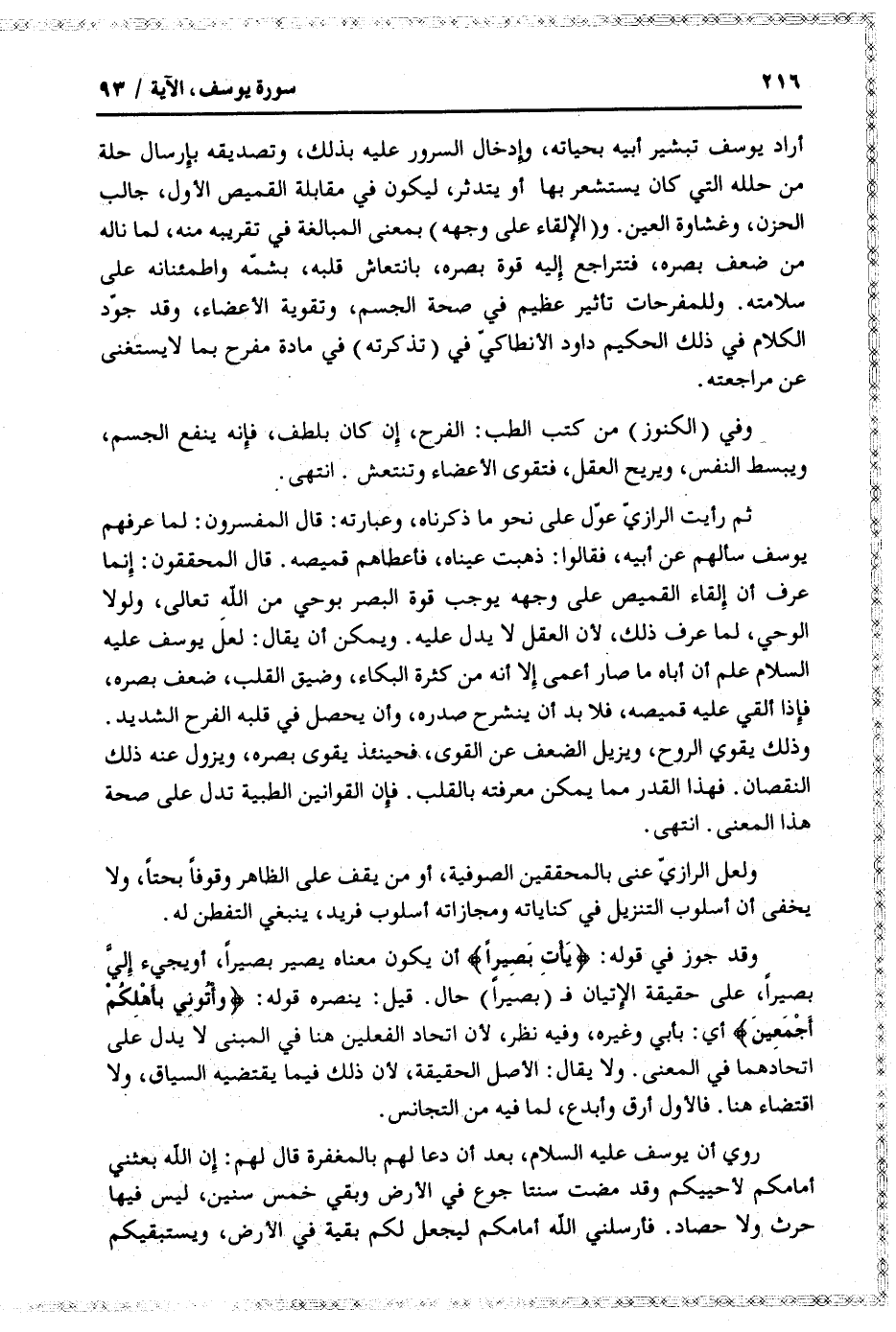ثم رأيت الرازيّ عوّل على نحو ما ذكرناه، وعبارته: قال المفسرون: لما عرفهم يوسف سألهم عن أبيه، فقالوا: ذهبت عيناه، فأعطاهم قميصه. قال المحققون: إنما عرف أن إلقاء القميص على وجهه يوجب قوة البصر بوحي من الله تعالى، ولولا الوحي، لما عرف ذلك، لأن العقل لا يدل عليه. ويمكن أن يقال: لعل يوسف عليه السلام علم أن أباه ما صار أعمى إلا أنه من كثرة البكاء، وضيق القلب، ضعف بصره، فإذا ألقي عليه قميصه، فلا بد أن ينشرح صدره، وأن يحصل في قلبه الفرح الشديد.