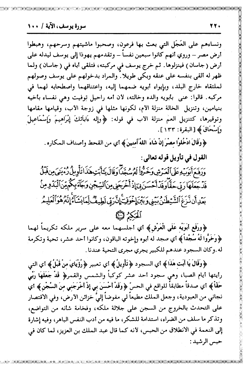 وَرَفَعَ أَبَوَيْهِ عَلَى الْعَرْشِ وَخَرُّوا لَهُ سُجَّداً وَقالَ يا أَبَتِ هذا تَأْوِيلُ رُءْيايَ مِنْ قَبْلُ قَدْ جَعَلَها رَبِّي حَقًّا وَقَدْ أَحْسَنَ بِي إِذْ أَخْرَجَنِي مِنَ السِّجْنِ وَجاءَ بِكُمْ مِنَ الْبَدْوِ مِنْ بَعْدِ أَنْ نَزَغَ الشَّيْطانُ بَيْنِي وَبَيْنَ إِخْوَتِي إِنَّ رَبِّي لَطِيفٌ لِما يَشاءُ إِنَّهُ هُوَ الْعَلِيمُ الْحَكِيمُ (100)