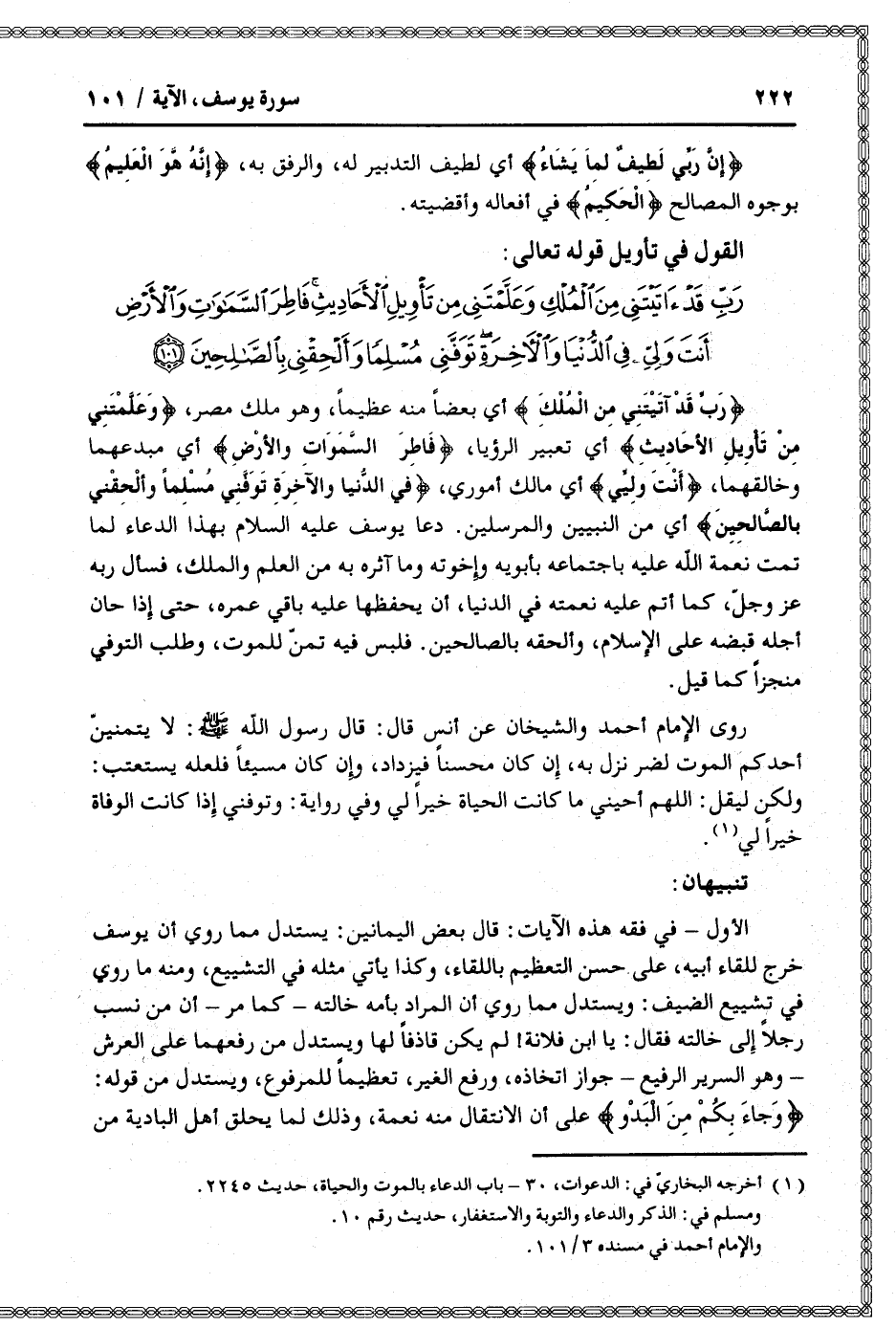 رَبِّ قَدْ آتَيْتَنِي مِنَ الْمُلْكِ وَعَلَّمْتَنِي مِنْ تَأْوِيلِ الْأَحادِيثِ فاطِرَ السَّماواتِ وَالْأَرْضِ أَنْتَ وَلِيِّي فِي الدُّنْيا وَالْآخِرَةِ تَوَفَّنِي مُسْلِماً وَأَلْحِقْنِي بِالصَّالِحِينَ (101)