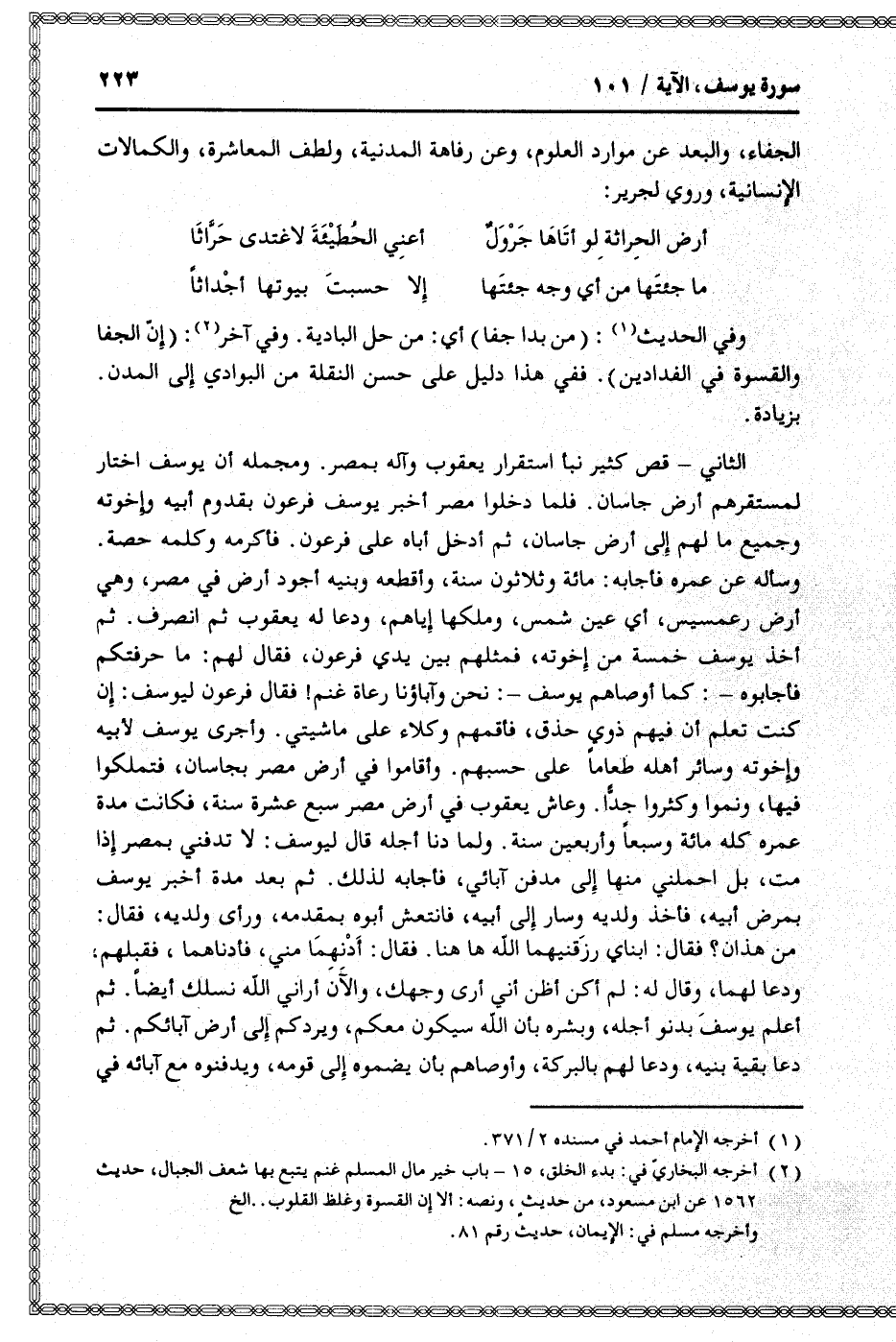 الثاني- قص كثير نبأ استقرار يعقوب وآله بمصر. ومجمله أن يوسف اختار لمستقرهم أرض جاسان. فلما دخلوا مصر أخبر يوسف فرعون بقدوم أبيه وإخوته وجميع ما لهم إلى أرض جاسان، ثم أدخل أباه على فرعون. فأكرمه وكلمه حصة.