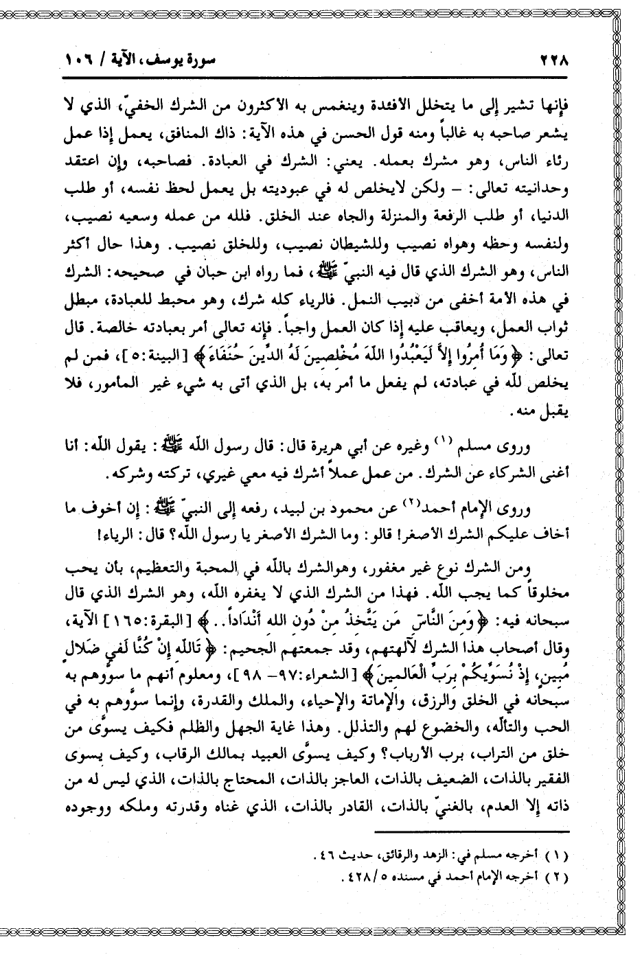 فإنها تشير إلى ما يتخلل الأفئدة وينغمس به الأكثرون من الشرك الخفيّ، الذي لا يشعر صاحبه به غالبا ومنه قول الحسن في هذه الآية: ذاك المنافق، يعمل إذا عمل رئاء الناس، وهو مشرك بعمله. يعني: الشرك في العبادة. فصاحبه، وإن اعتقد وحدانيته تعالى: - ولكن لا يخلص له في عبوديته بل يعمل لحظ نفسه، أو طلب الدنيا، أو طلب الرفعة والمنزلة والجاه عند الخلق. فلله من عمله وسعيه نصيب، ولنفسه وحظه وهواه نصيب وللشيطان نصيب، وللخلق نصيب. وهذا حال أكثر الناس، وهو الشرك الذي قال فيه النبيّ صلى الله عليه وسلم، فما
