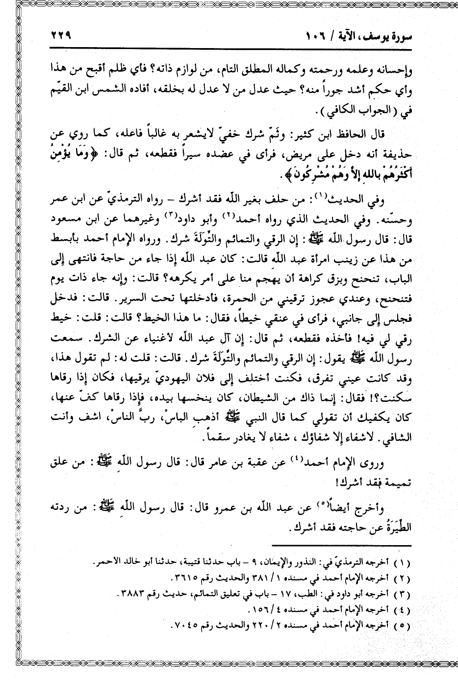 قال الحافظ ابن كثير: وثمّ شرك خفيّ لا يشعر به غالبا فاعله، كما روي عن حذيفة أنه دخل على مريض، فرأى في عضده سيرا فقطعه، ثم قال: وَما يُؤْمِنُ أَكْثَرُهُمْ بِاللَّهِ إِلَّا وَهُمْ مُشْرِكُونَ.