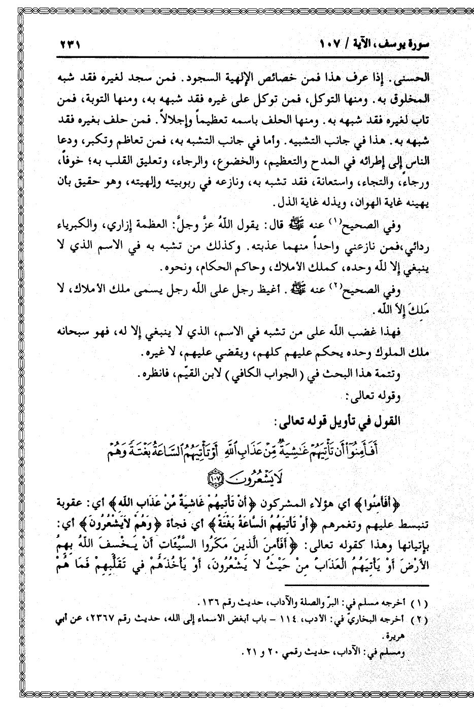 أَفَأَمِنُوا أَنْ تَأْتِيَهُمْ غاشِيَةٌ مِنْ عَذابِ اللَّهِ أَوْ تَأْتِيَهُمُ السَّاعَةُ بَغْتَةً وَهُمْ لا يَشْعُرُونَ (107)