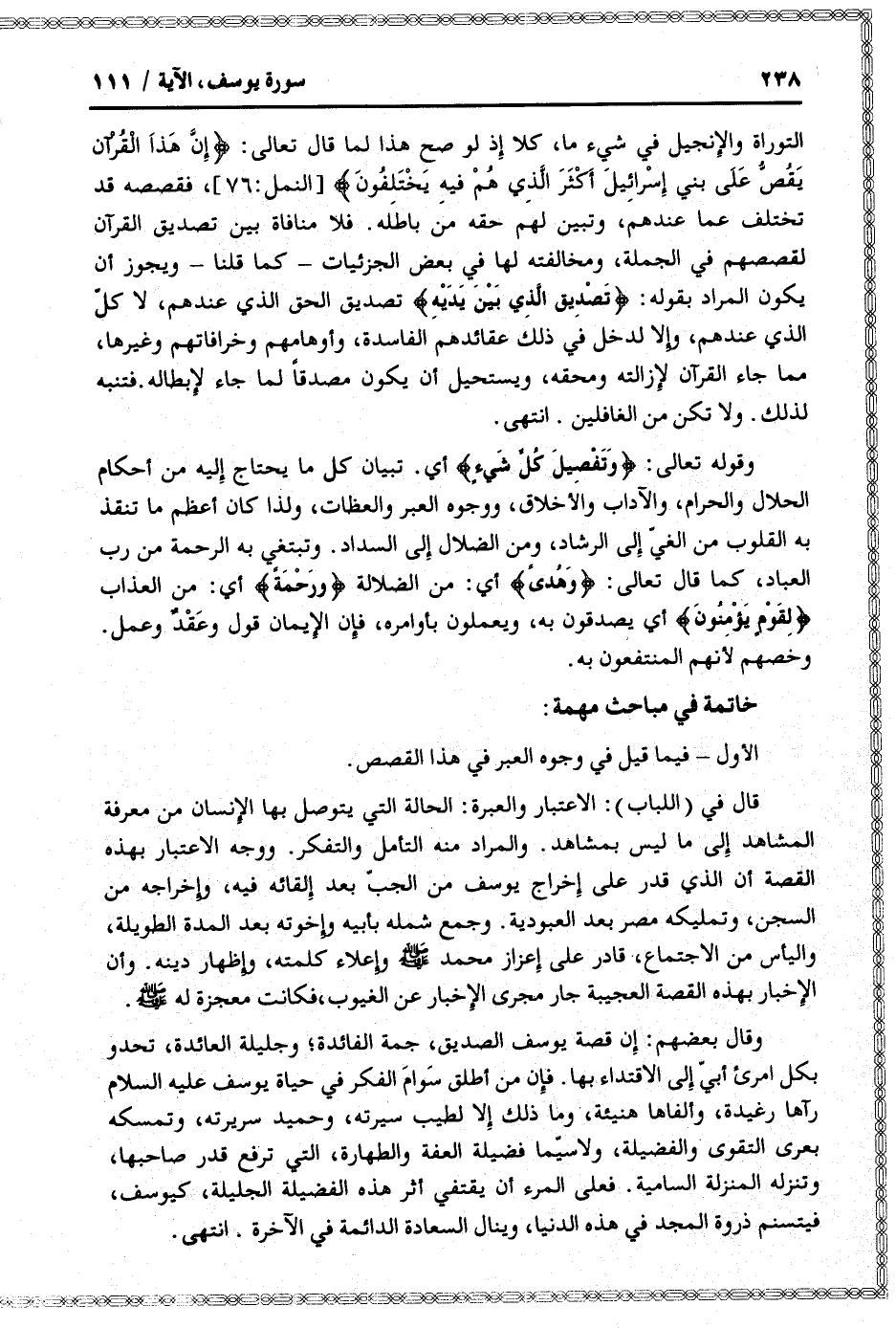 قال في (اللباب) : الاعتبار والعبرة: الحالة التي يتوصل بها الإنسان من معرفة المشاهد إلى ما ليس بمشاهد. والمراد منه التأمل والتفكر. ووجه الاعتبار بهذه القصة أن الذي قدر على إخراج يوسف من الجبّ بعد إلقائه فيه، وإخراجه من السجن، وتمليكه مصر بعد العبودية. وجمع شمله بأبيه وإخوته بعد المدة الطويلة، واليأس من الاجتماع، قادر على إعزاز محمد صلى الله عليه وسلم وإعلاء كلمته، وإظهار دينه. وأن الإخبار بهذه القصة العجيبة جار مجرى الإخبار عن الغيوب، فكانت معجزة له صلى الله عليه وسلم.