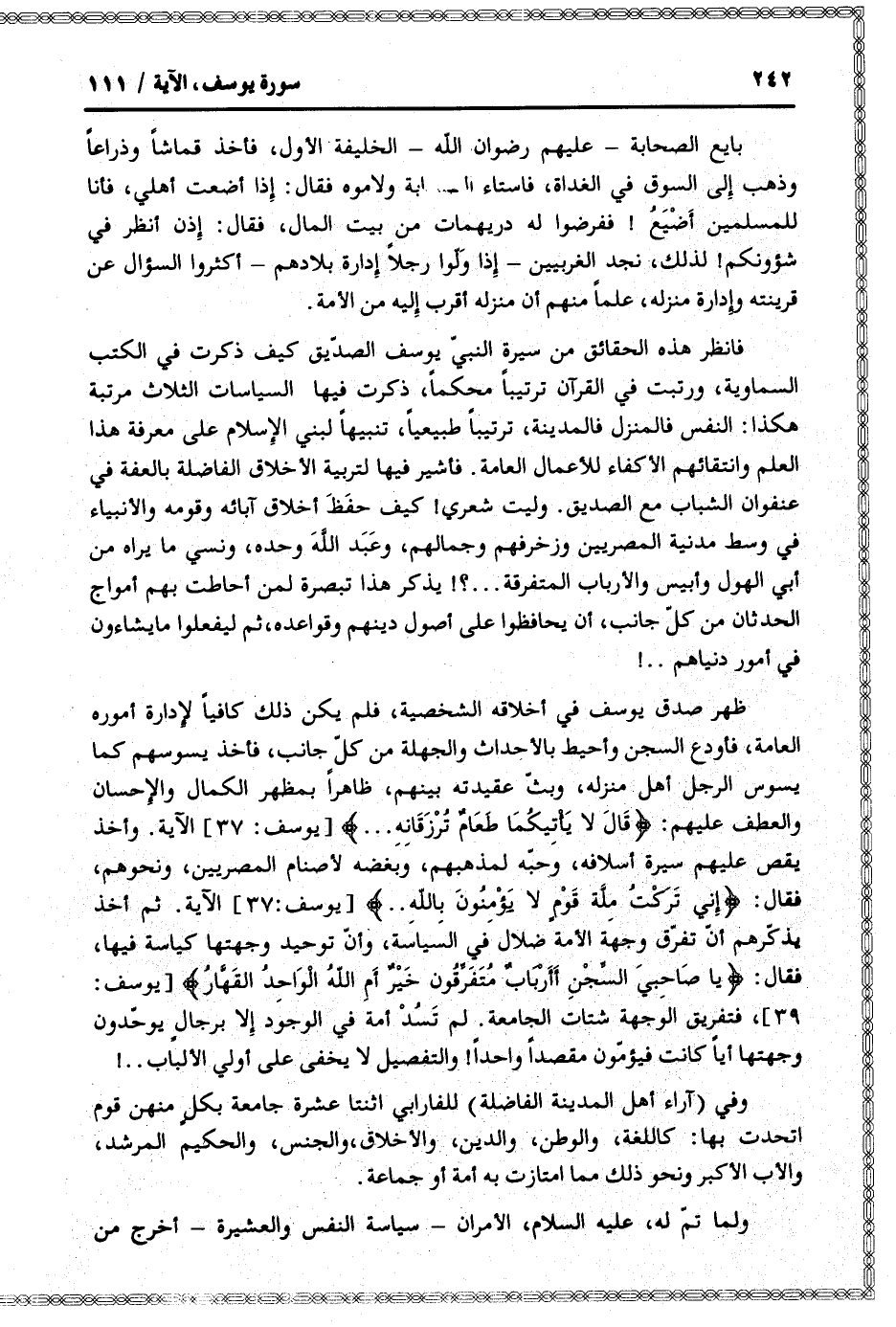 فانظر هذه الحقائق من سيرة النبيّ يوسف الصدّيق كيف ذكرت في الكتب السماوية، ورتبت في القرآن ترتيبا محكما، ذكرت فيها السياسات الثلاث مرتبة هكذا: النفس فالمنزل فالمدينة، ترتيبا طبيعيا، تنبيها لبني الإسلام على معرفة هذا العلم وانتقائهم الأكفاء للأعمال العامة. فأشير فيها لتربية الأخلاق الفاضلة بالعفة في عنفوان الشباب مع الصديق. وليت شعري! كيف حفظ أخلاق آبائه وقومه والأنبياء في وسط مدنية المصريين وزخرفهم وجمالهم، وعبد الله وحده، ونسي ما يراه من أبي الهول وأبيس والأرباب المتفرقة ... ؟! يذكر هذا تبصرة لمن أحاطت بهم أمواج الحدثان من كلّ جانب، أن يحافظوا على أصول دينهم وقواعده، ثم ليفعلوا ما يشاءون في أمور دنياهم..!