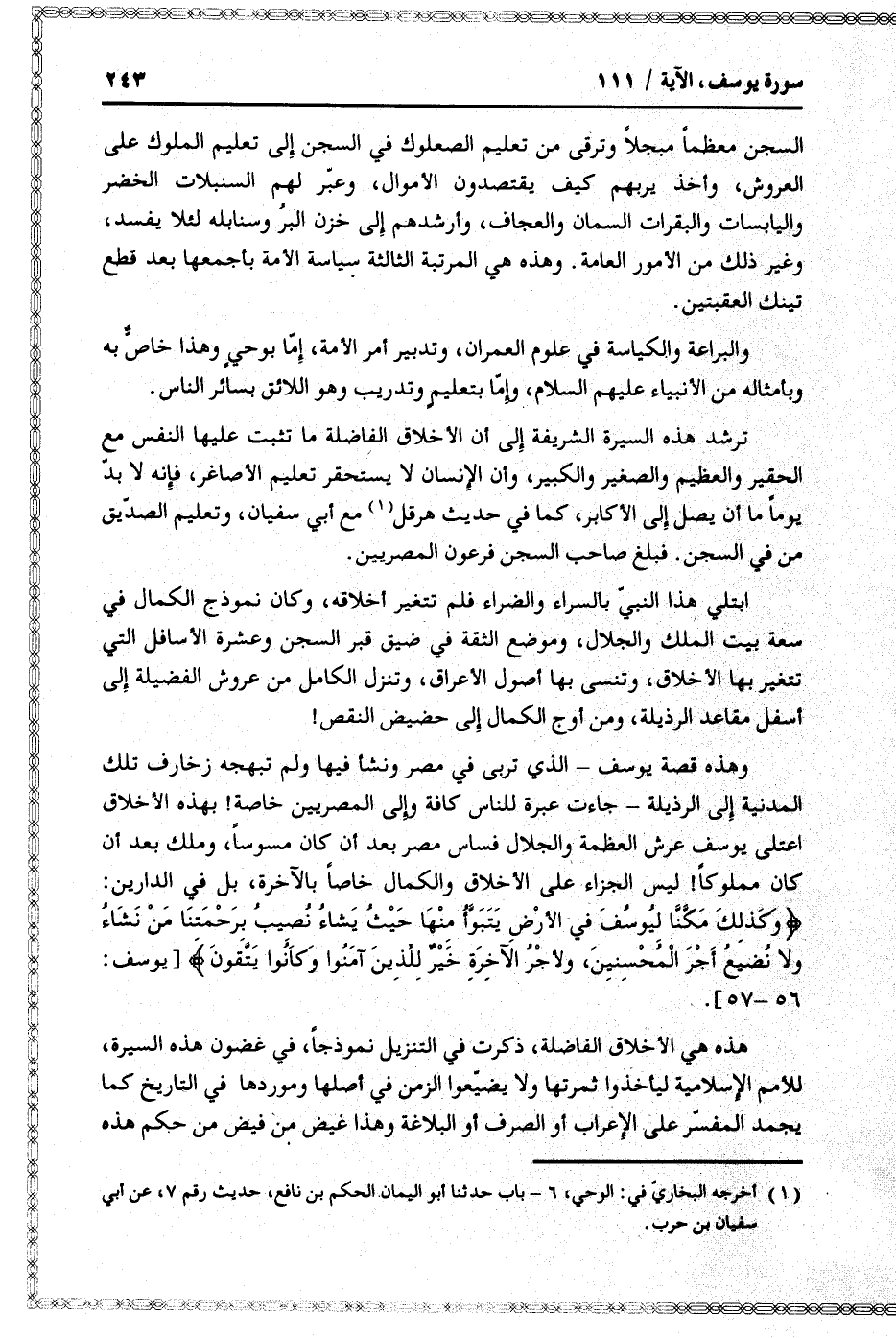 هذه هي الأخلاق الفاضلة، ذكرت في التنزيل نموذجا، في غضون هذه السيرة، للأمم الإسلامية ليأخذوا ثمرتها ولا يضيّعوا الزمن في أصلها وموردها في التاريخ كما يجمد المفسّر على الإعراب أو الصرف أو البلاغة وهذا غيض من فيض من حكم هذه